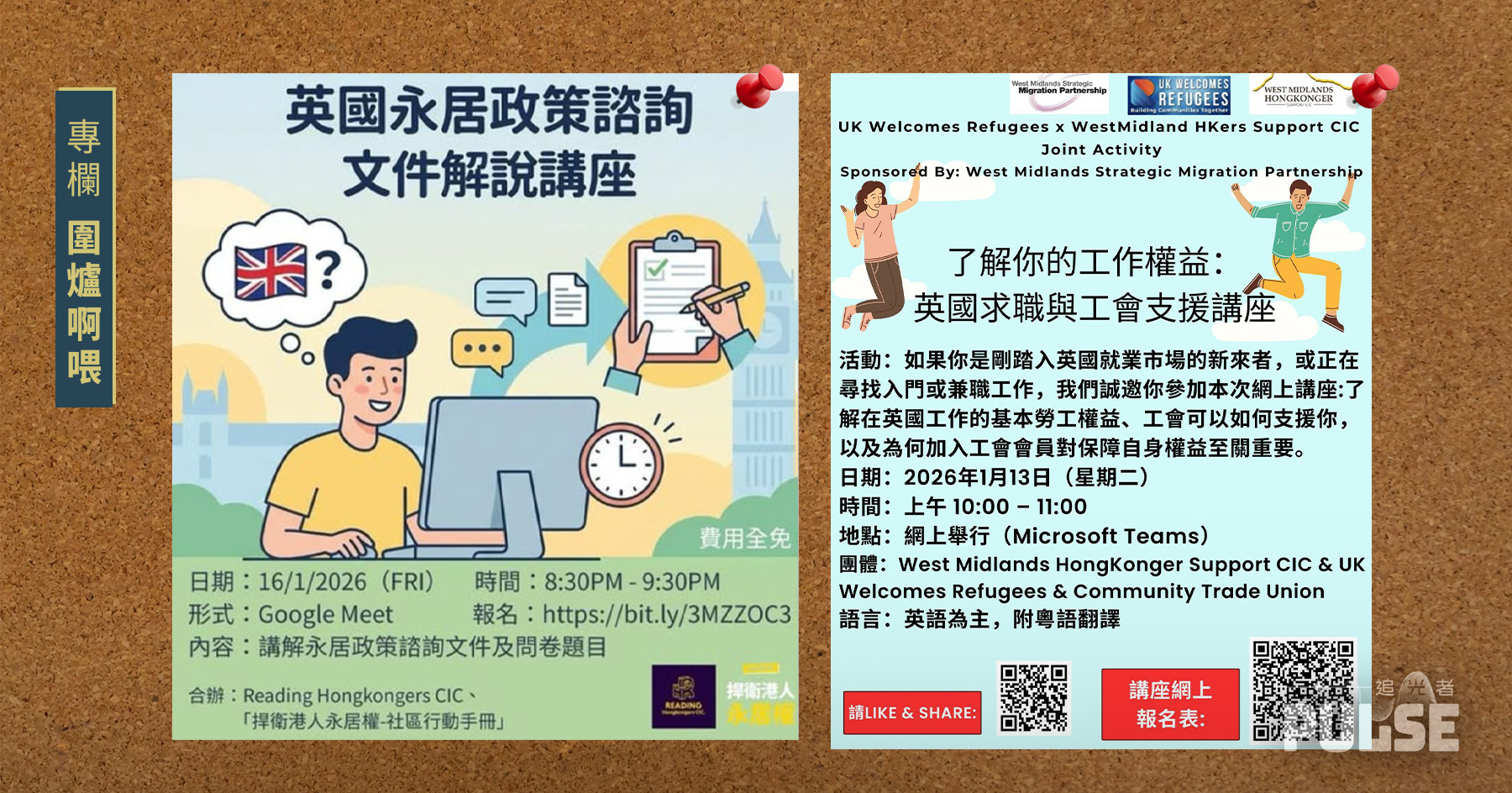 海外港人活動繼續有!英國永居政策諮詢期仲有一個月左右,在英港人團體下周五(16日)舉行網上講座,拆解諮詢文件重點,協助大家喺截止前完成政府問卷,向英國政府發聲。英國求職與工會支援網上講座則會在下周二(13日)舉行,協助求職者了解在英國工作的基本勞工權益。