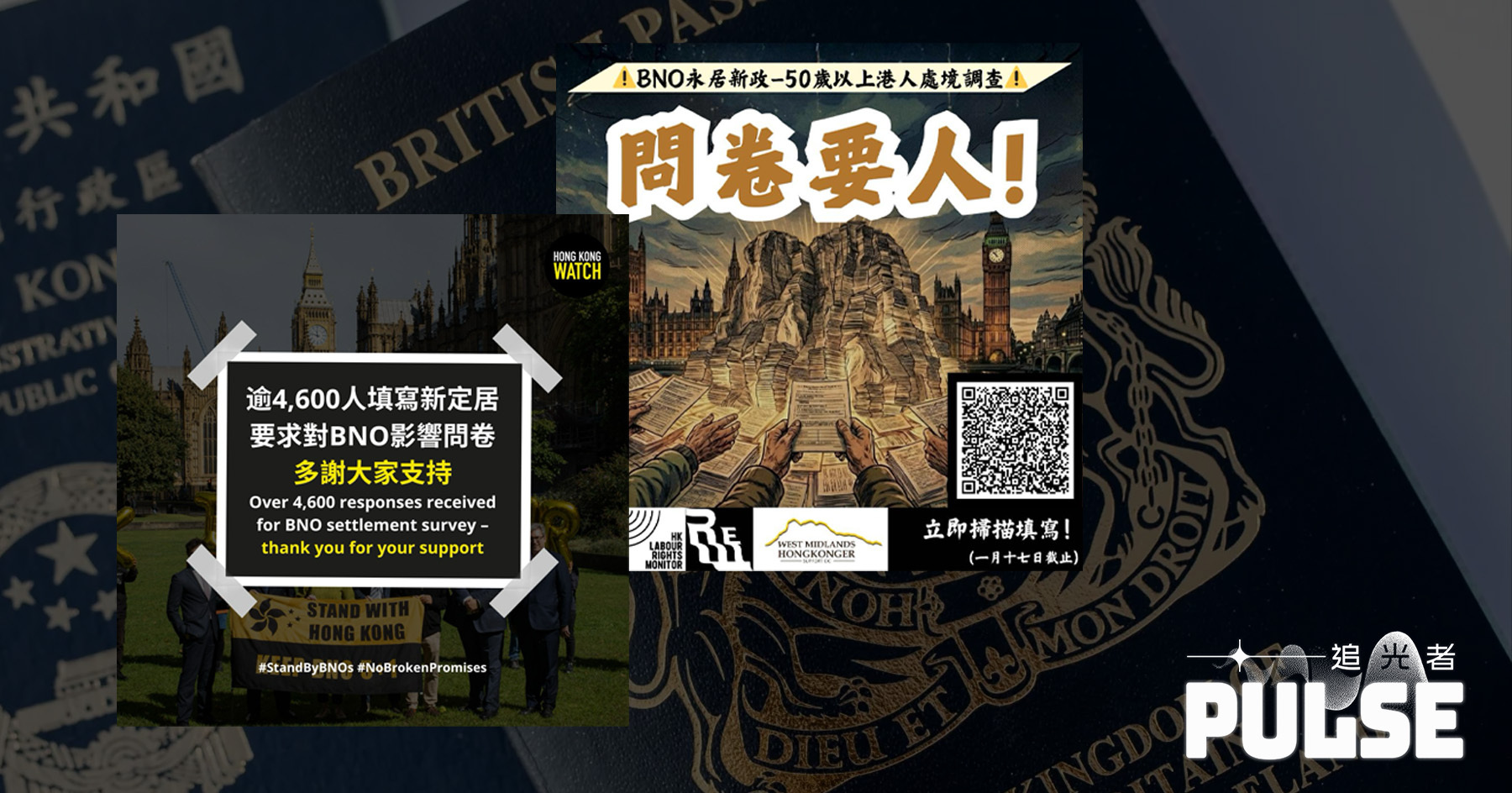 「 問卷要人!」「代為廣傳!!!」英國永居政策改革諮詢下月12日結束,多個團體發起問卷調查,得到在英BN(O)港人熱烈支持。香港監察(Hong Kong Watch)的問卷調查,短短兩星期內共收到4,639份回應,遠超原定2,000份目標。有發起意見調查的團體向《追光者》表示,他們的問卷截至周五(16日)暫時收到1,700份回應,反映港人緊張關心事件;提醒港人不要「坐定粒六」,呼籲大家把握餘下諮詢時間,繼續努力發聲,讓英國本地人知道港人投入英國社會。