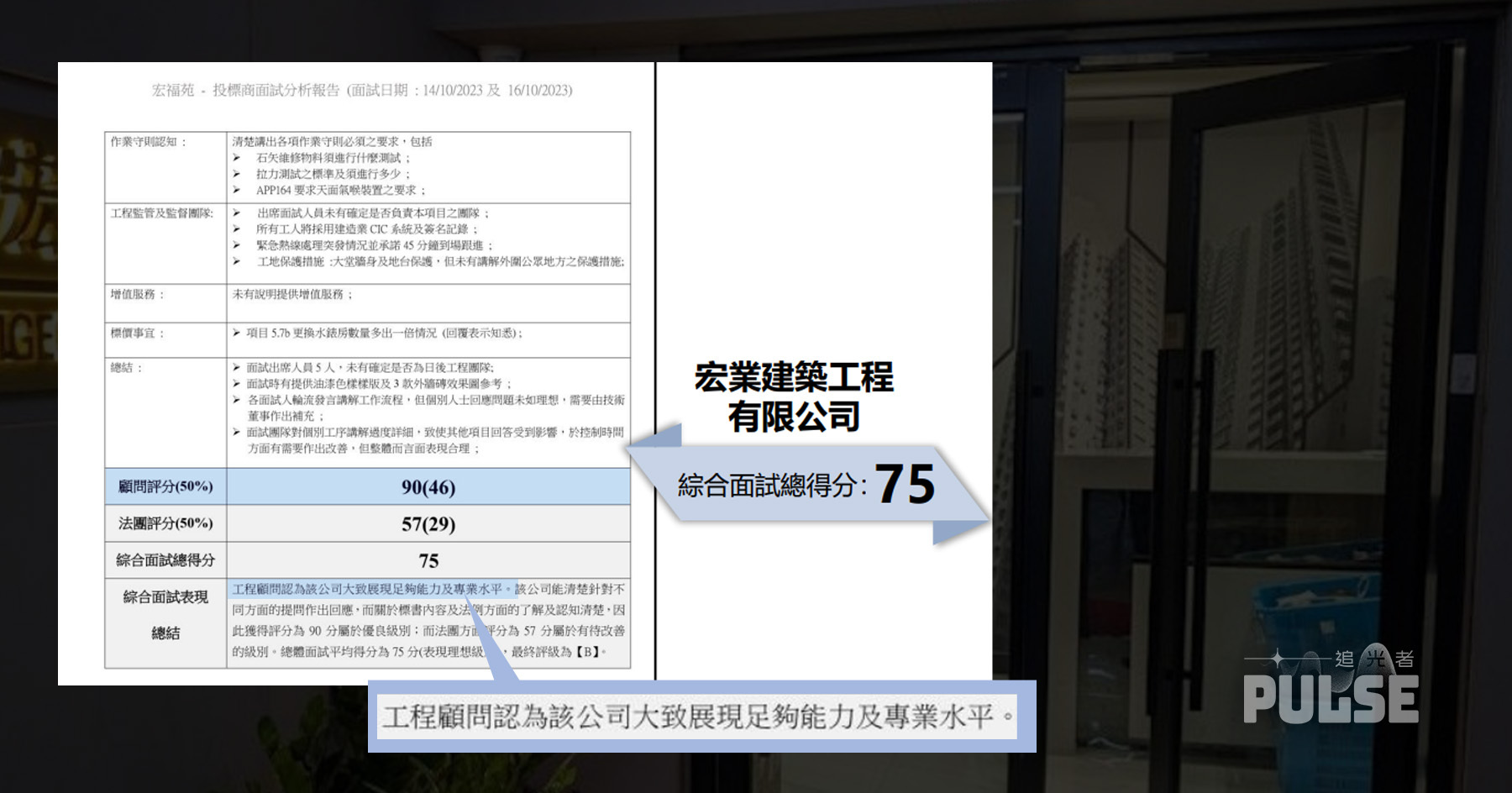 報告指出,工程顧問之後建議法團考慮接見宏業以及其他八間被列作次選的投標公司。按市建局指引,法團也要邀請五間最低回標報告的公司進行面試,合共有14間投標公司獲得面試機會。文件顯示,宏業建築綜合面試總分為75分,是14間獲邀面試的標商中得分排名第三,與另外兩間標商同列B級。
