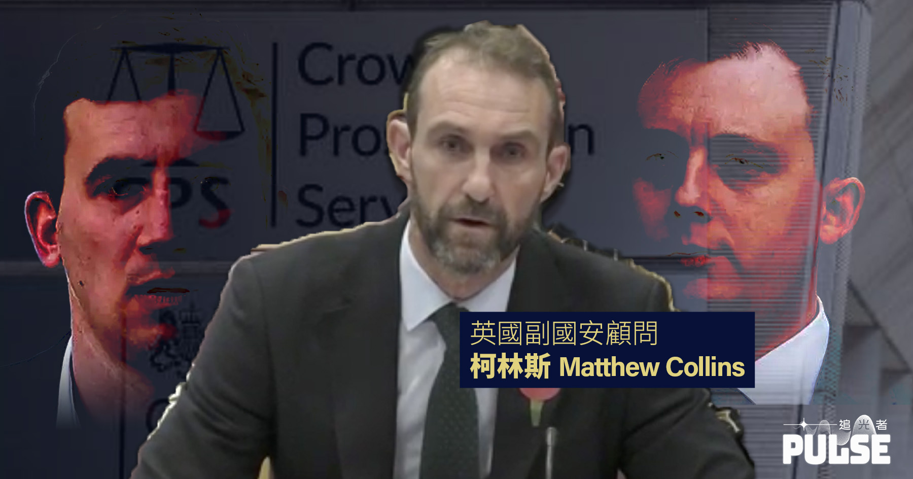 英國副國安顧問柯林斯(Matthew Collins)表示,他在中共間諜案中前後提交的3份證供,雖然未能按控方要求將中國標籤為威脅,但認為實際上供詞已指出中國在經濟、民主制度及網絡基礎建設等多方面都對英國構成威脅。他表示在今年9月3日跟控方開會時才首次得悉可能撤控,對案件最後被撤銷感到驚訝及失望。不過,皇家檢控署(CPS)就指早在8月中,已向柯林斯表達其供詞沒有將中國定義為威脅的疑慮。