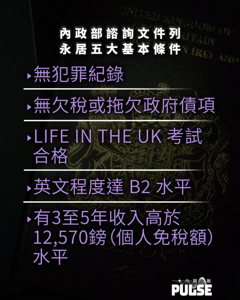 移英港人另一個關注焦點,是入籍的英文試要求會否由現時的 B1 提升至 B2 水平。諮詢文件在名為「強制要求(mandatory requirements)」的章節中提到,所有申請永居者除了要「 Life in the UK」考試合格,亦必須要達到 B2 程度的英文水平。另外要沒有犯罪紀錄,以及沒有欠稅或拖欠國民保健服務或其他政府債項。文件又建議所有永居申請者過去3至5年內年收入要高於12,570鎊(約128,248.6港元)個人免稅額水平,以及要有供國民保險(NI)或交稅的紀錄。
