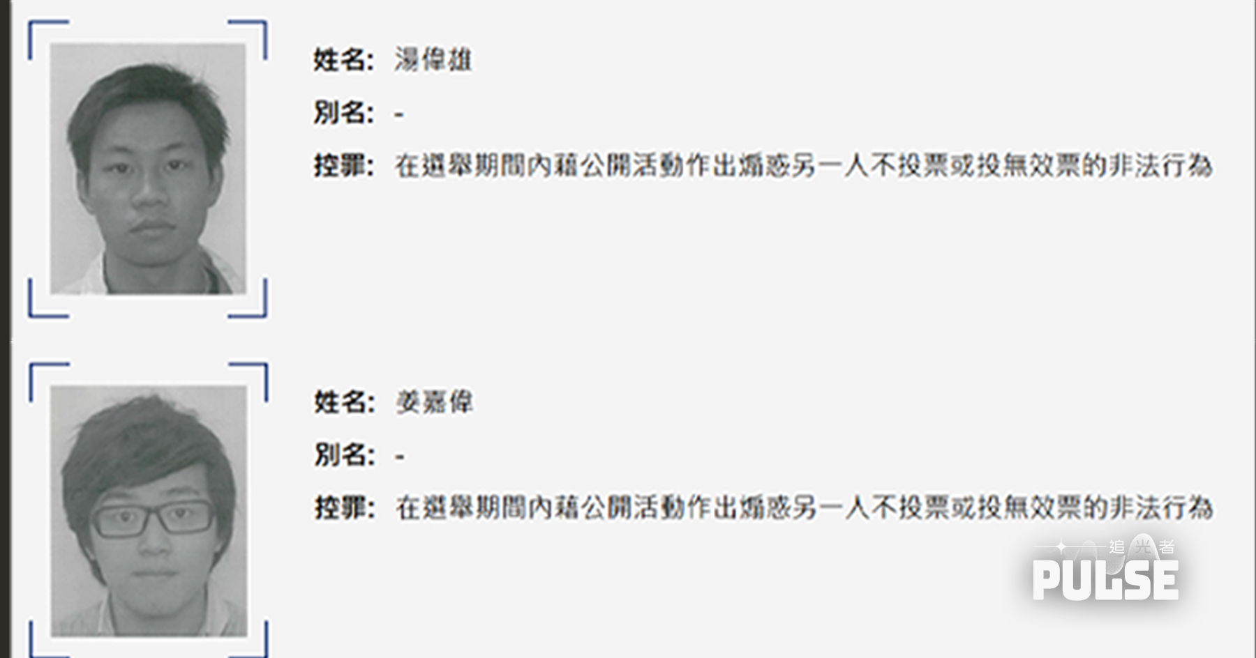 廉署的新聞稿指,調查顯示,姜嘉偉及湯偉雄曾各自於不同社交媒體專頁,發布煽惑他人在立法會選舉中不投票的貼文,兩人被控以違反《選舉條例》中的「在選舉期間內藉公開活動作出煽惑另一人不投票的非法行為」。廉署嚴厲譴責兩人試圖干擾及破壞立法會選舉,並重申,在選舉期間公開煽惑他人不投票或投無效票會觸犯法例,轉載相關內容亦屬違法。