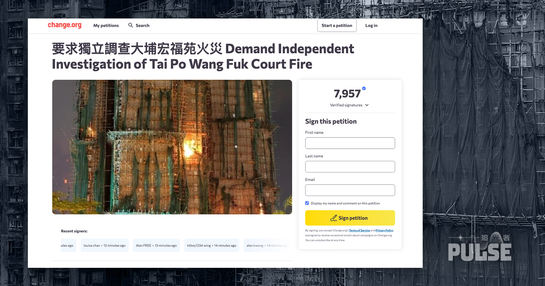 宏福苑致命五級火,至今死亡人數增至146人。有巿民組成「大埔宏福苑火災關注組」並發起網上聯署,聯署發起人之一關靖豐周六(29日)被國安處拘捕,聯署亦即時終止。有海外港人接續發起聯署,向港府同樣提出四大訴求,截至今(1日)下午已有約7,800聯署,聯署發起人之一Louis表示,有人被迫噤聲,所以想把港人的聲音延續下去,「直至真相大白,才會停止」。