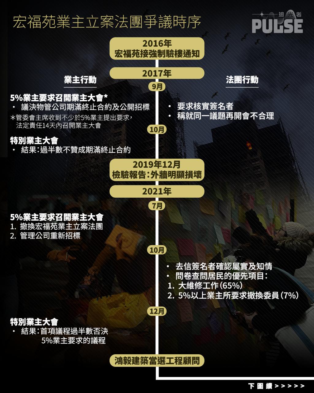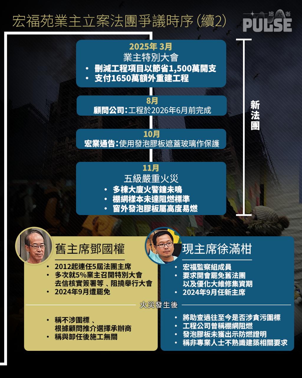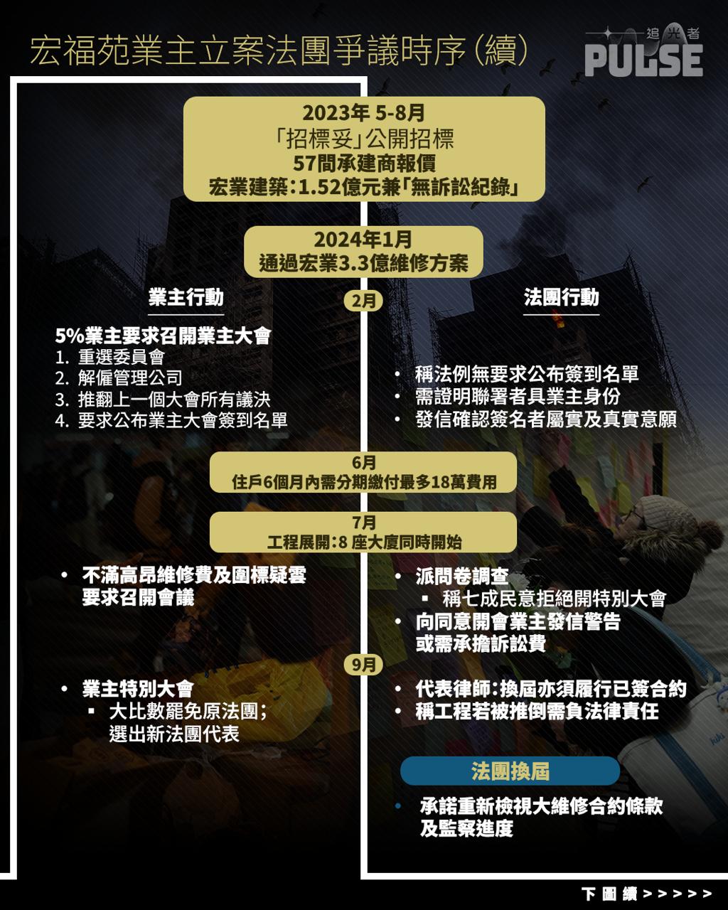大埔宏福苑大火奪走最少159人性命,多人仍然下落不明,事發後法團爭議、工程黑箱作業與疑似貪污問題相繼浮現。宏福苑 3.3 億港元天價大維修由前屆業主立案法團拍板,因造價高昂一直引起業主強烈不滿,多次要求依法召開業主大會均遭阻延,直至去年居民始成功罷免舊法團。翻查紀錄所見,業主在過去數年已多次啟動「5%機制」,要求撤換法團並重審不同合約。