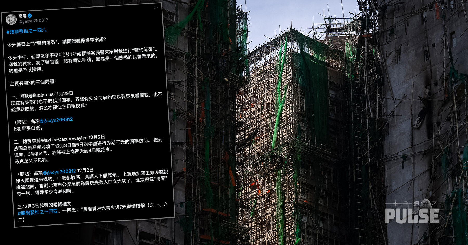 大埔宏福苑大火引起海內外關注,中國獨立記者高瑜日前發文評論,昨(8日)透露被警察上門做筆錄,其中被問及她寫的兩篇火災相關文章,她不禁反問「誰要保護李家超」。