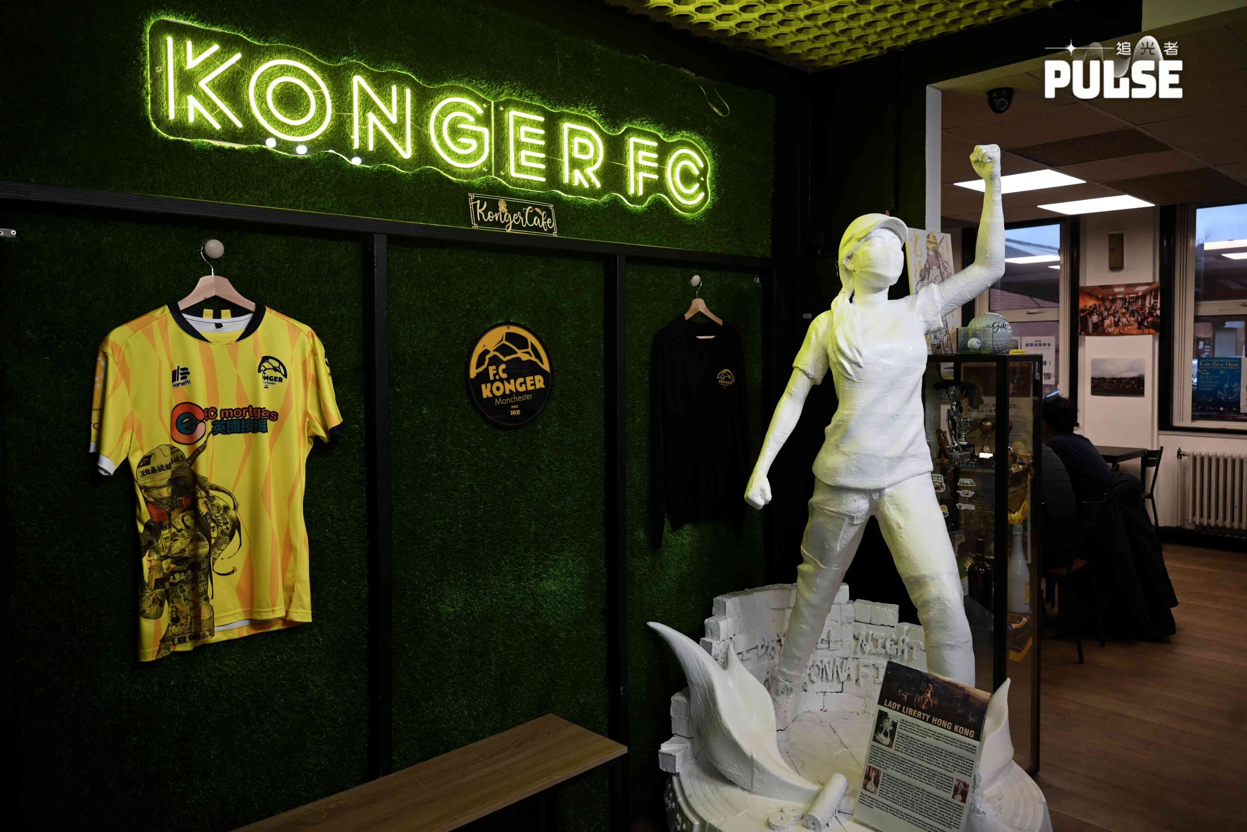 以2019年中大保衞戰的被捕女生為藍本的中大民主女神像,今年9月由德國運抵英國塞頓(Sutton),在當地一間獨立戲院原本安排永久展出,惟該戲院今年11月起突然永久關閉,所以「民女」需要尋找新地方安置,最後以曼徹斯特為基地的港人球會 Konger FC 同意借出旗下餐廳接手展出雕像。