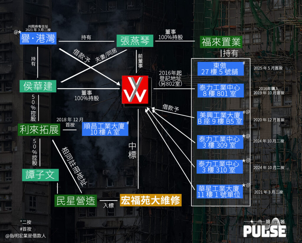 宏福苑大維修工程承建商宏業的老闆侯華建,早前被警方以涉嫌誤殺拘捕,當局指有人為約10萬港元「蠅頭小利」,購買不符合阻燃標準的棚網。《追光者》調查發現,自2020年底武漢肺炎疫情起,侯華建及其妻張燕琴分別為至少6處物業辦理按揭,當中有5處指明宏業是借款人(borrower),有4處涉及「二按」,包括兩人共同持有位於新蒲崗價值逾2,300萬元的「譽.港灣」豪宅單位,相關款項至今仍未清還。由於其按揭全屬「無上限貸款」,有評論員相信分判商很大機會無法討回費用,或會導致「骨牌式」結業潮。