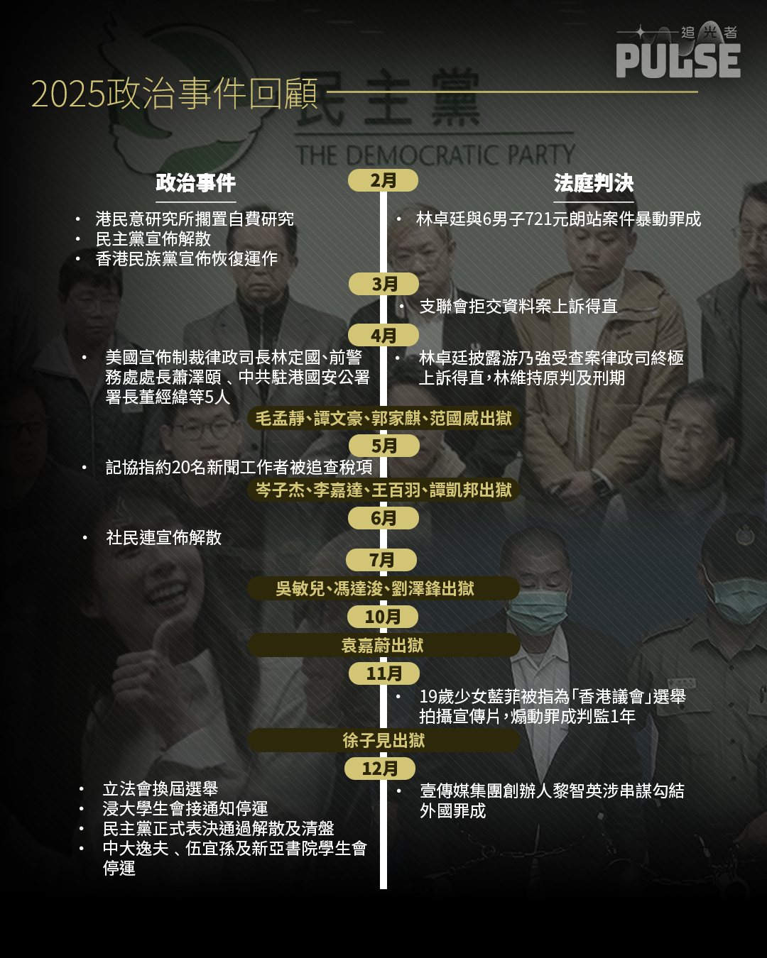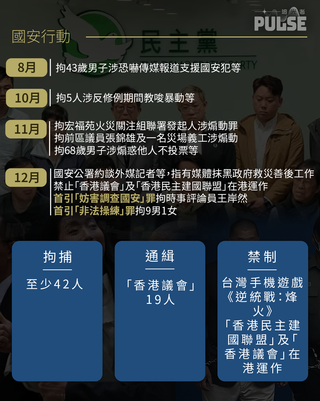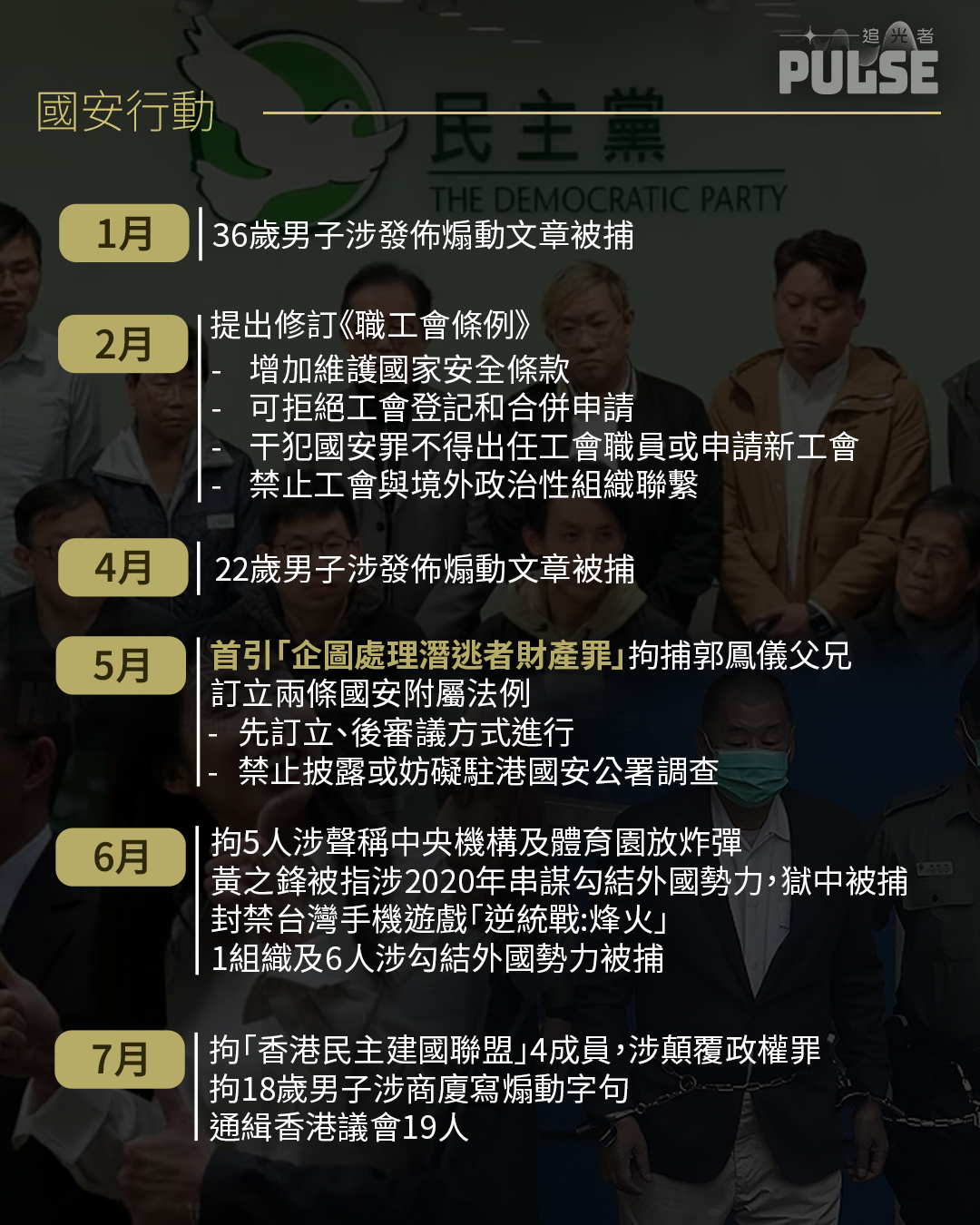 2025年香港政治環境持續惡化。港府於年中迅速訂立《國安法》附屬法例,採取「先訂立、後審議」的方式,短短兩日內訂立並即時生效。年內,國安處至少拘捕42人、通緝19人,並首次拘捕流亡人士的家屬,同時亦首次引用「妨害國安調查」及「非法操練」等罪名執法。