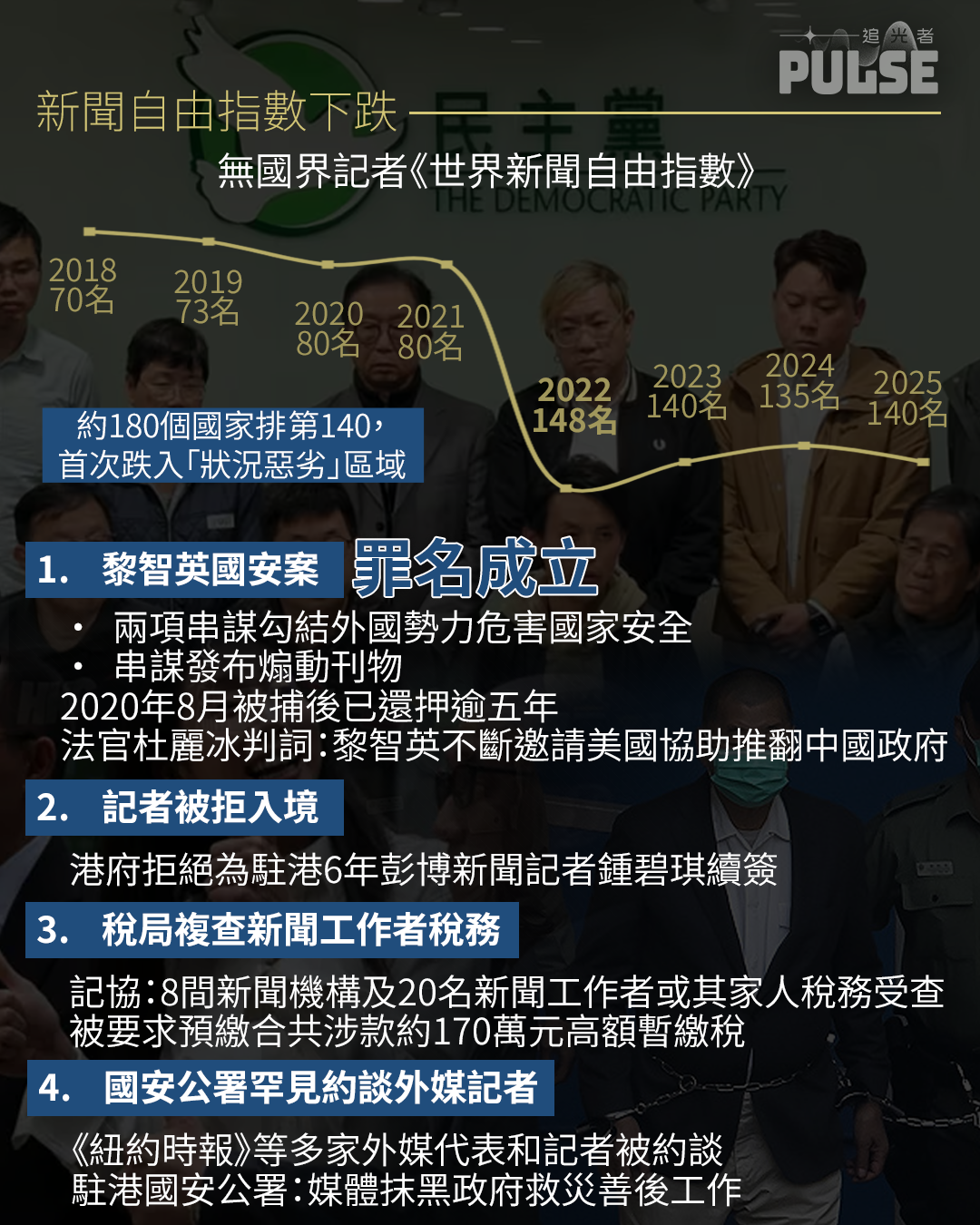 新聞自由方面,香港於2025年的排名首次跌入「狀況惡劣」級別。加上黎智英國安案作出判決、外媒記者被拒簽證,以及中共駐港國安公署約談外媒代表等事件,均反映香港新聞自由空間進一步收窄。