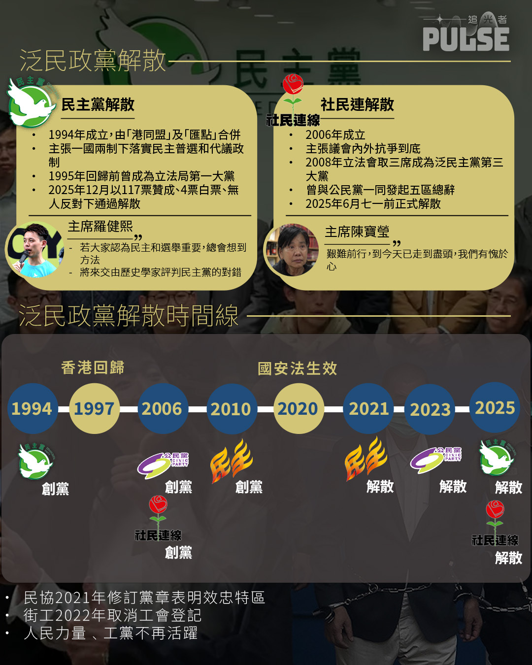 與此同時,隨着民主黨及社民連相繼解散,泛民主派政黨正式「清零」。而在大埔致命火災的背景下,立法會選舉仍如期舉行,投票率約三成,投票人數創下主權移交以來新低。多名七旬議員宣佈不再參選,令議會出現大換血,90個議席中約44%由新人出任。