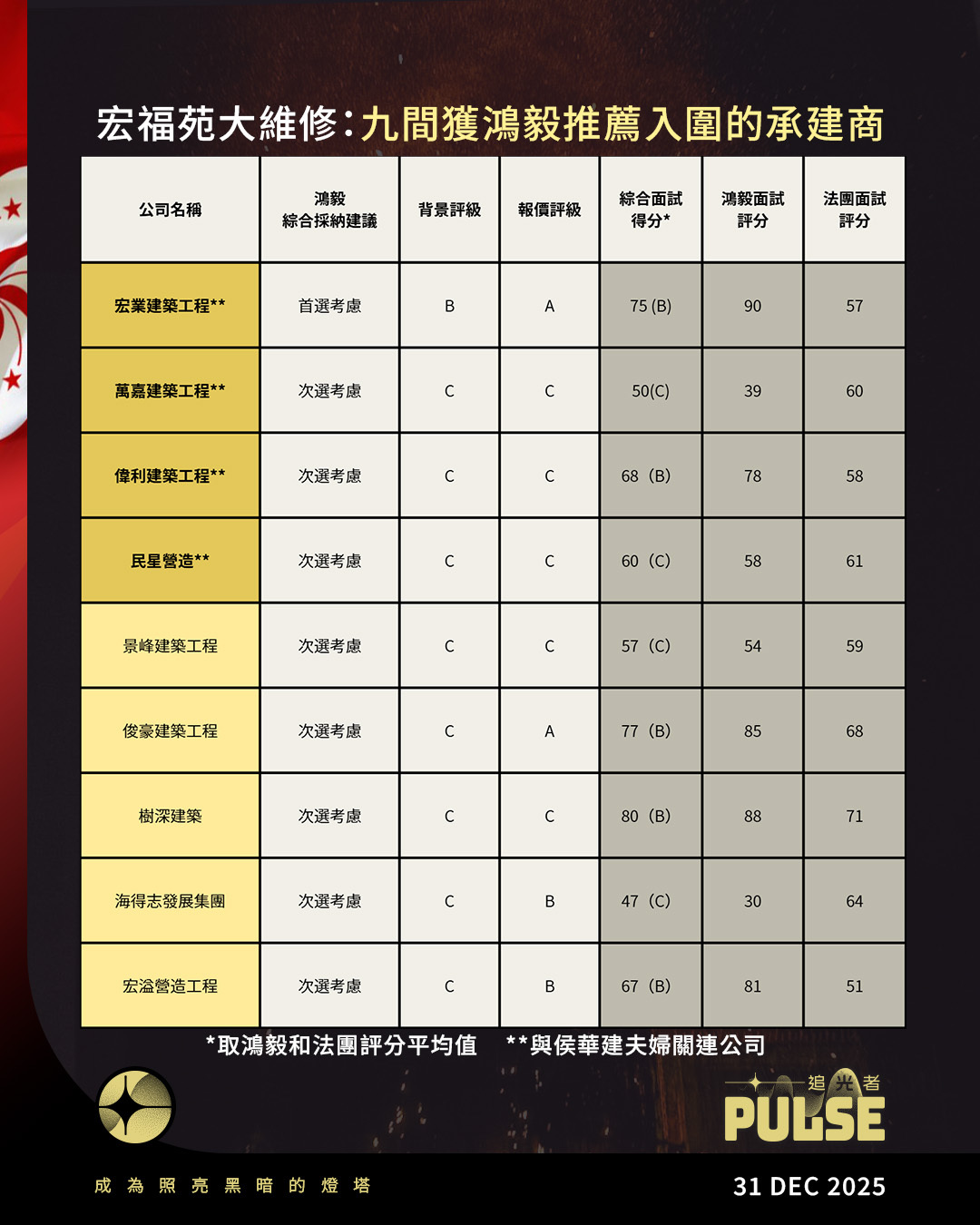 宏福苑大火.調查報道|宏業涉圍標證據曝光   九承建商獲薦入圍天價維修   揭四間與侯華建夫婦關係緊密