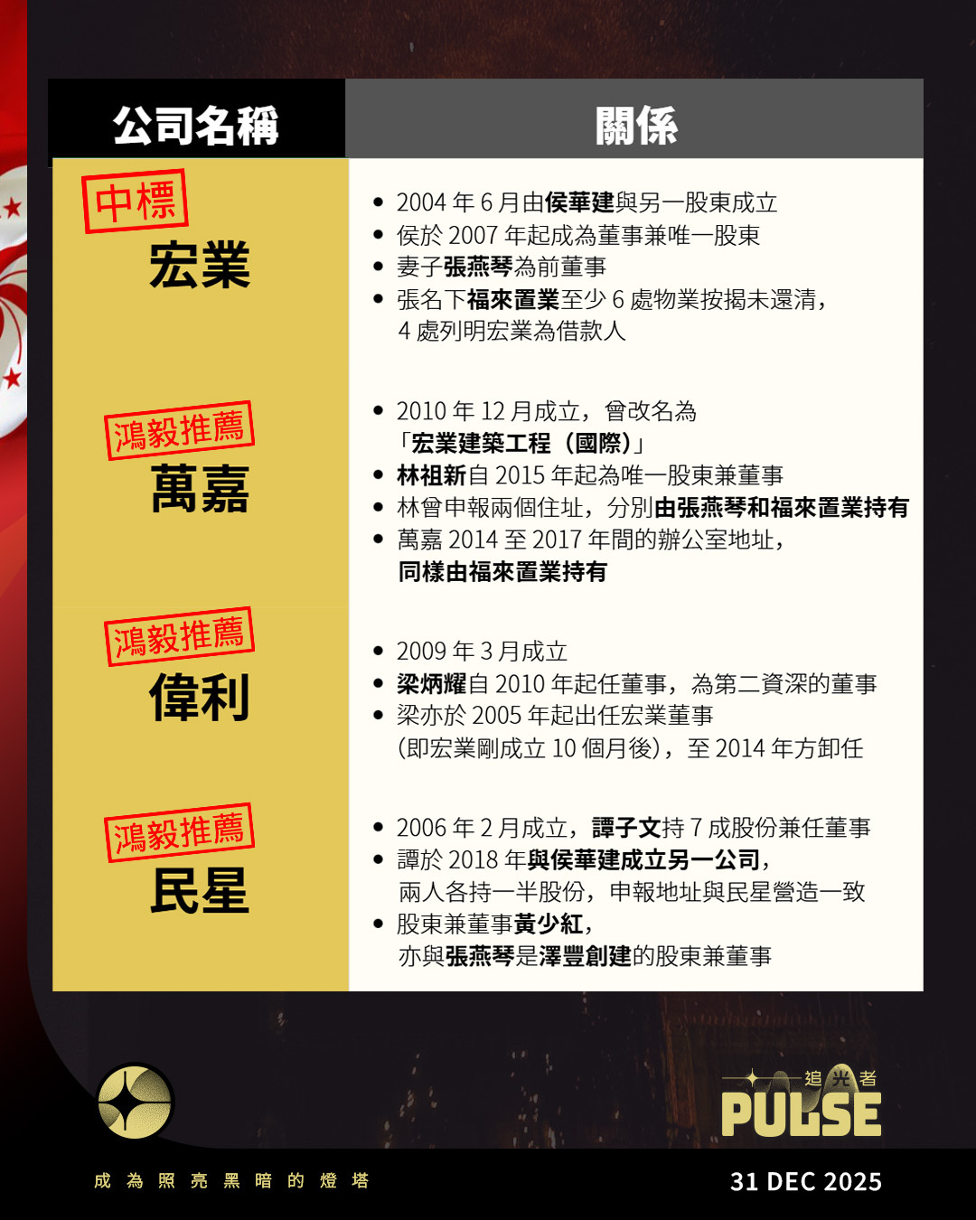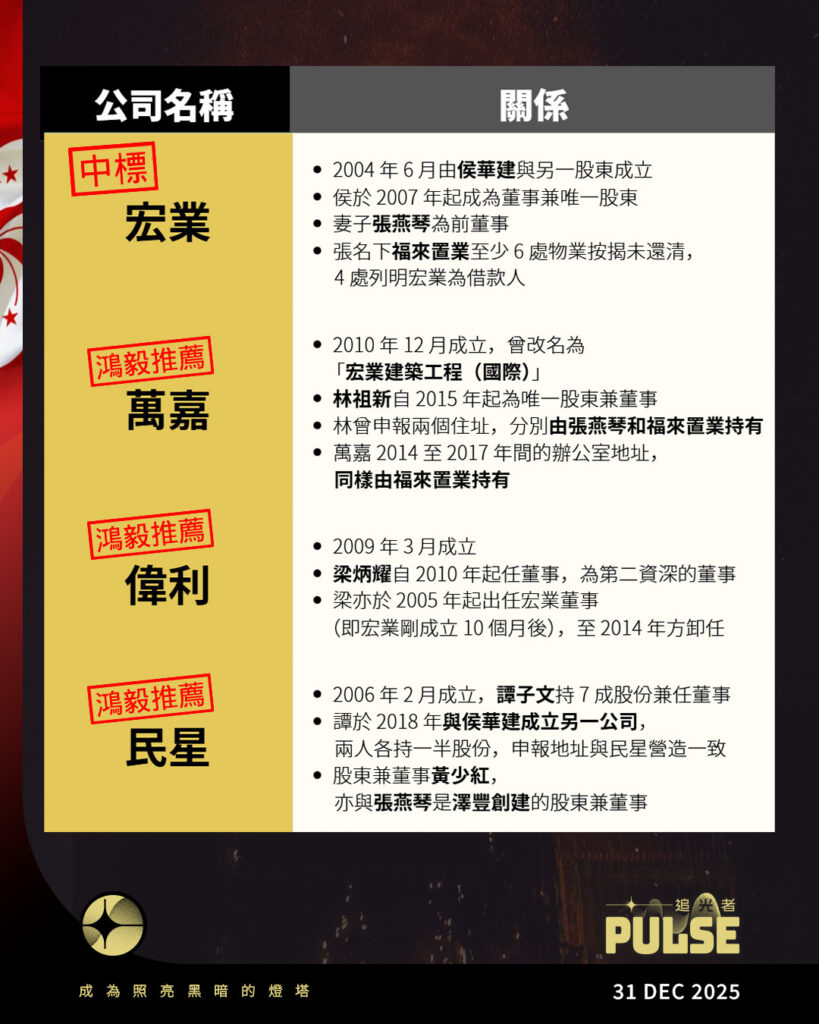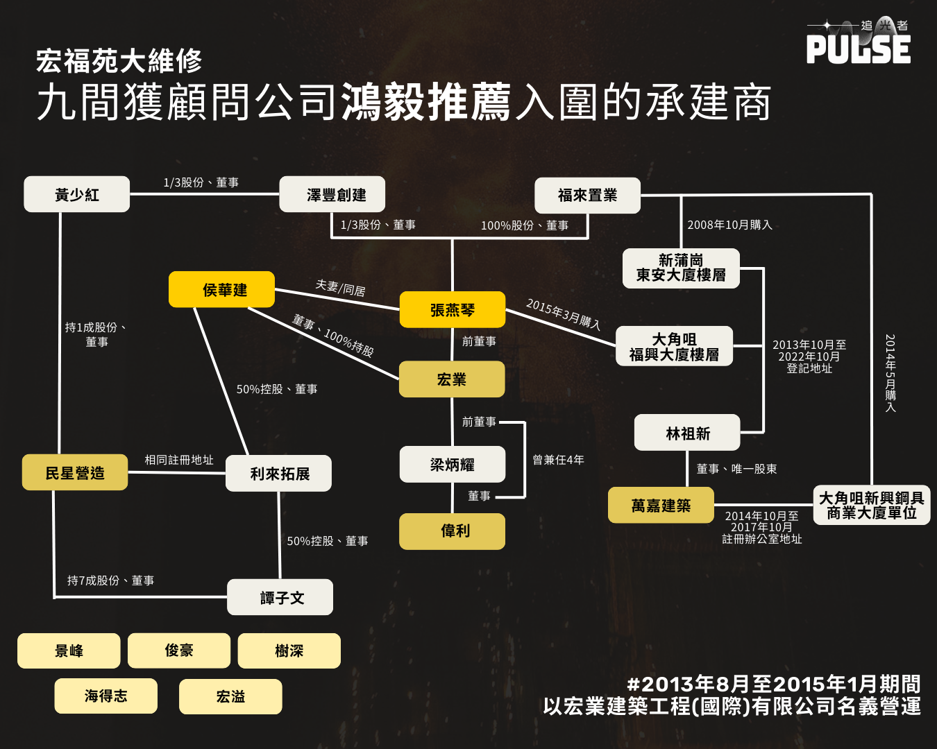 宏福苑3.3億元天價大維修工程承建商宏業建築工程有限公司老闆侯華建,早前被警方以涉嫌誤殺拘捕。《追光者》調查發現,顧問公司鴻毅推薦入圍的9間建築商中,連同宏業在內有4間與侯華建及其妻張燕琴關係密切。當中,有建築商改名前稱「宏業(國際)」,其辦公室及董事登記地址由張燕琴持有;另一間的董事為宏業前董事;有人則同時是張燕琴名下公司和其中一間建築商的股東和董事。