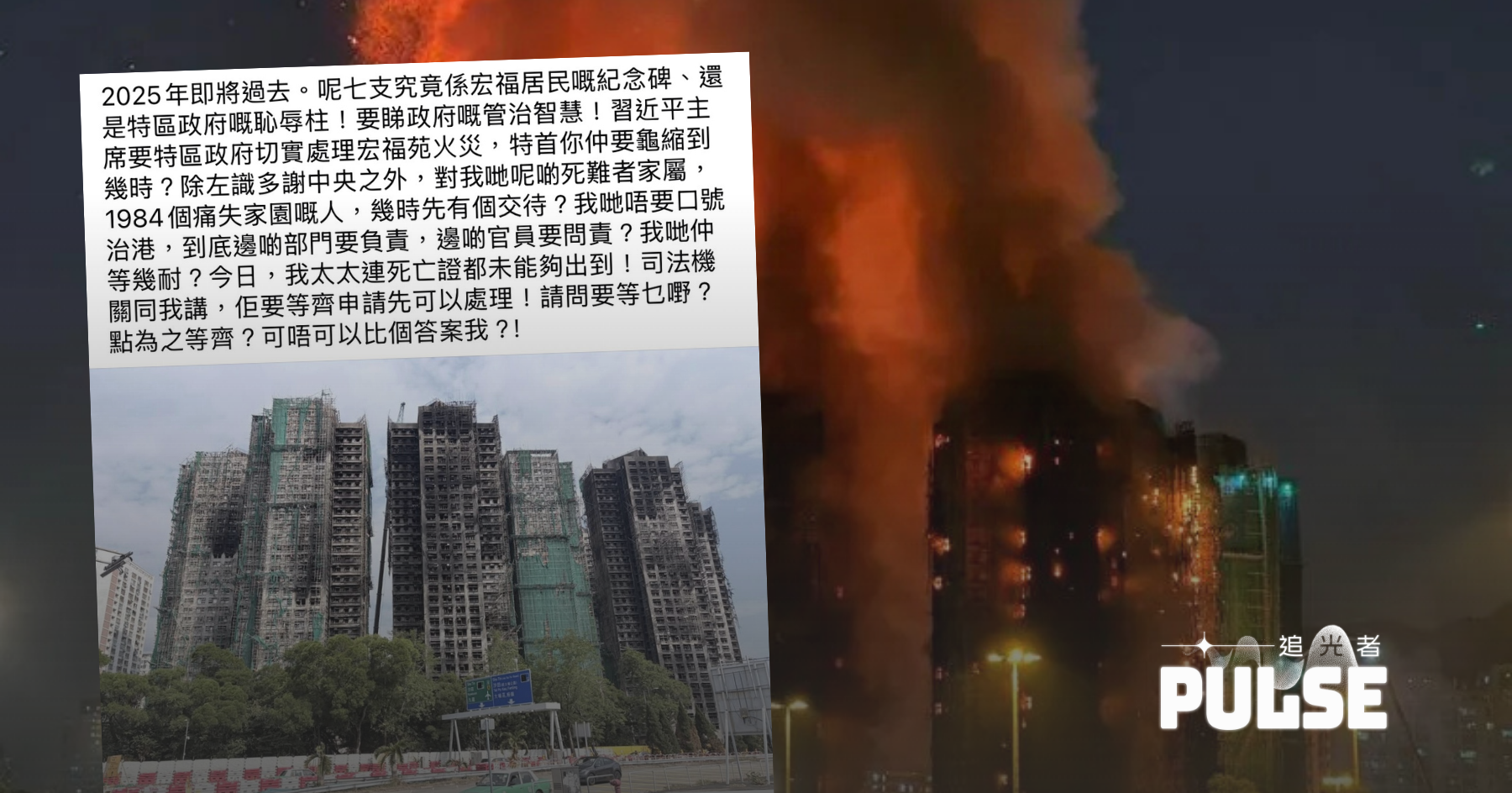 大埔宏福苑火災發生超過一個月,大量善後工作仍有待處理。有宏福苑災民在大除夕於社媒發文,批評司法機構遲遲未能批出亡妻的死亡證,引述職員稱需要等齊其他申請才可一併處理,災民質問:「請問要等乜嘢?點為之等齊?可唔可以比個答案我?!」有網民批評政府至今仍未公佈死者名單,亦有人留言指至今仍未有任何官員問責下台。