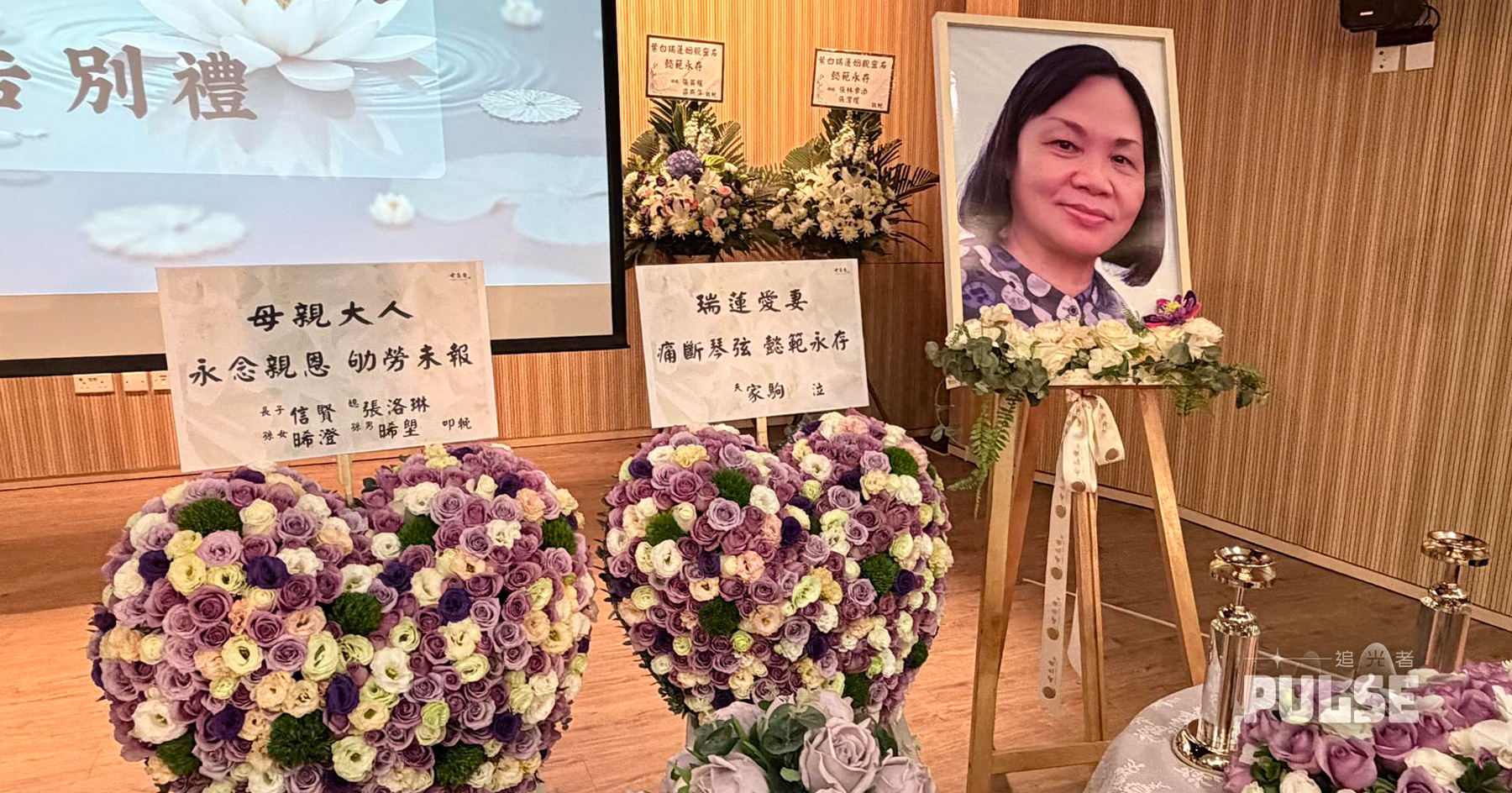 「瑞蓮愛妻:痛斷琴弦,懿範永存」這是葉先生送給亡妻的花牌,與兒子所置的花牌並放與太太遺照旁,而兒子的花牌則寫上「母親大人:永念親恩,劬勞未報」。心形的花牌以紫色、粉黃及白色玫瑰花為主,靈堂佈置亦簡潔,有別於傳統喪禮。葉先生回覆本台時表示:「太太喜歡寧靜,所以選用告別儀式。」
