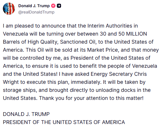 特朗普周二(6日)在其社交平台發帖文,指委內瑞拉臨時政府將向美國「交出」(turning over)三至五千萬桶原油,美方將以市價出售該批原油,收入由特朗普本人以美國總統身份控制,「確保美國及委內瑞拉人受惠」。