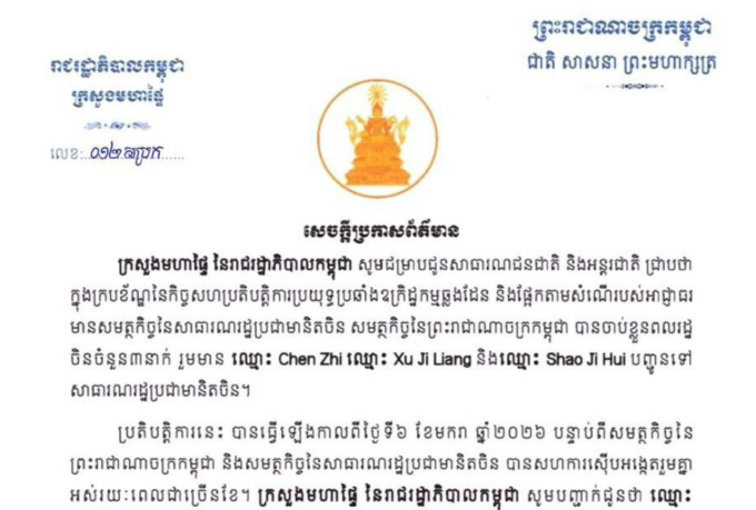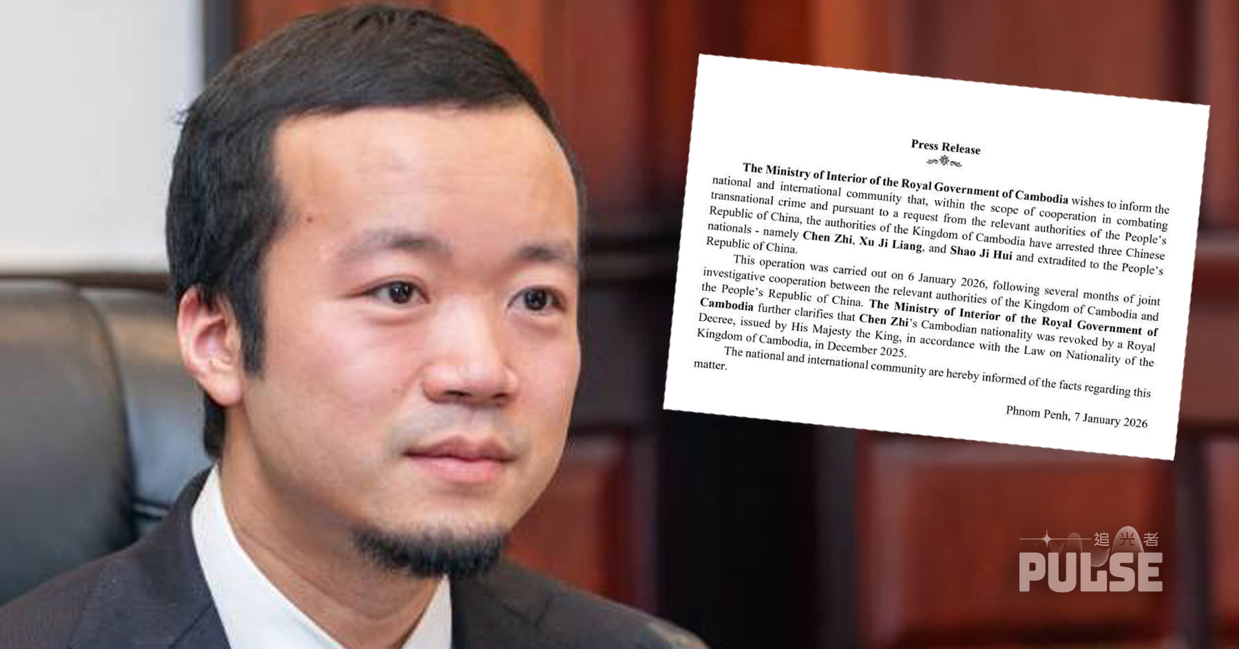 柬埔寨內政部周三晩上發表聲明,指柬方應中國當局要求合作調查多月後,周二(6日)採取行動拘捕三名中國公民,包括太子控股集團主席陳志,其餘二人為 Xu Ji Liang 及 Shao Ji Hui,並已將三人遣送到中國。內政部又指,柬埔寨皇室上月根據《柬埔寨國籍法》頒令褫奪陳志的柬埔寨公民身份。