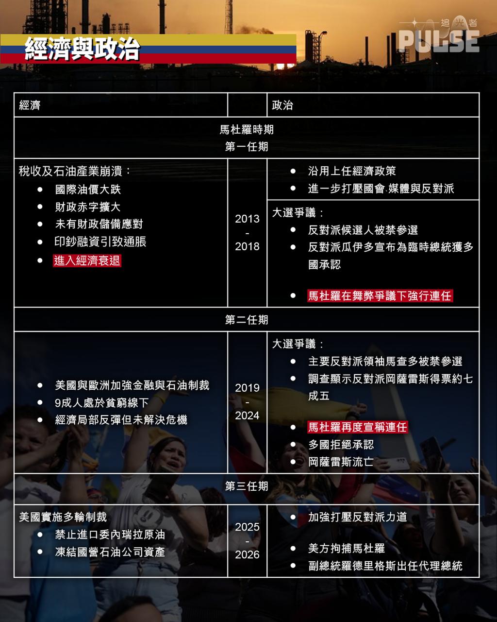 前總統查維斯(Hugo Chávez) 1999年上台後,推行反美、反市場路線,國有化企業並嚴控價格,阻礙市場生產力並導致國家經濟單一化,其親信馬杜羅(Nicolás Maduro)接任後延續其施政路線,以致國內人均 GDP 暴跌、國家生活物資餖缺,至今超過700萬人外逃。同時,馬杜羅在後期兩次大選中均被質疑舞弊,但仍自行宣佈勝選連任,被多個國家拒絕承認其正當性及實施制裁,進一步加速委內瑞拉的衰敗。