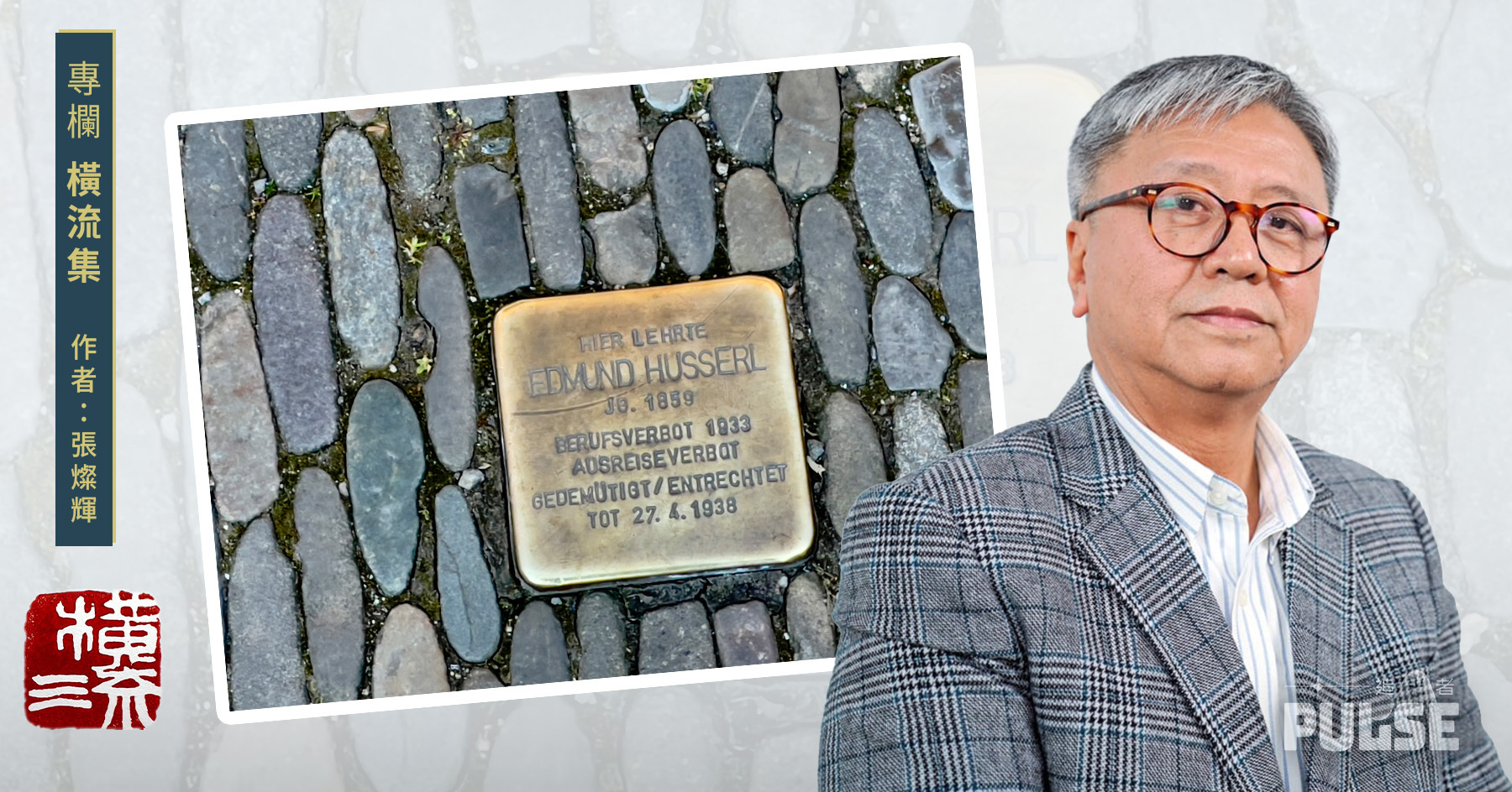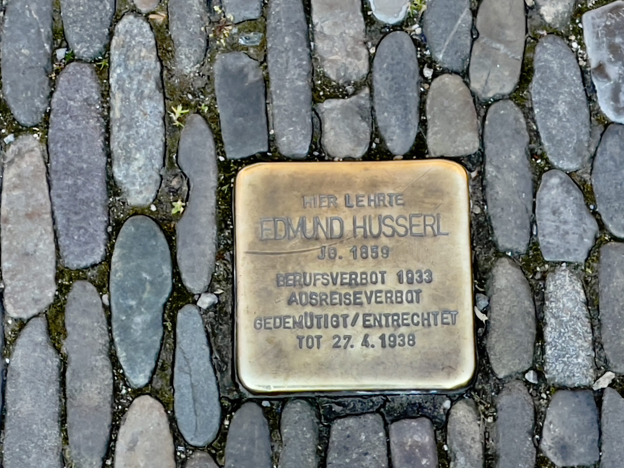 德國弗萊堡大學正門一塊「絆腳石」,其實一塊銅片,上面刻着:「胡塞爾在此任教,1859年出生,1933年禁止教學,禁止外遊,剝奪政治權利。1938年4月27日去世。」胡塞爾是猶太人,現象學創始哲學家。(作者拍攝)