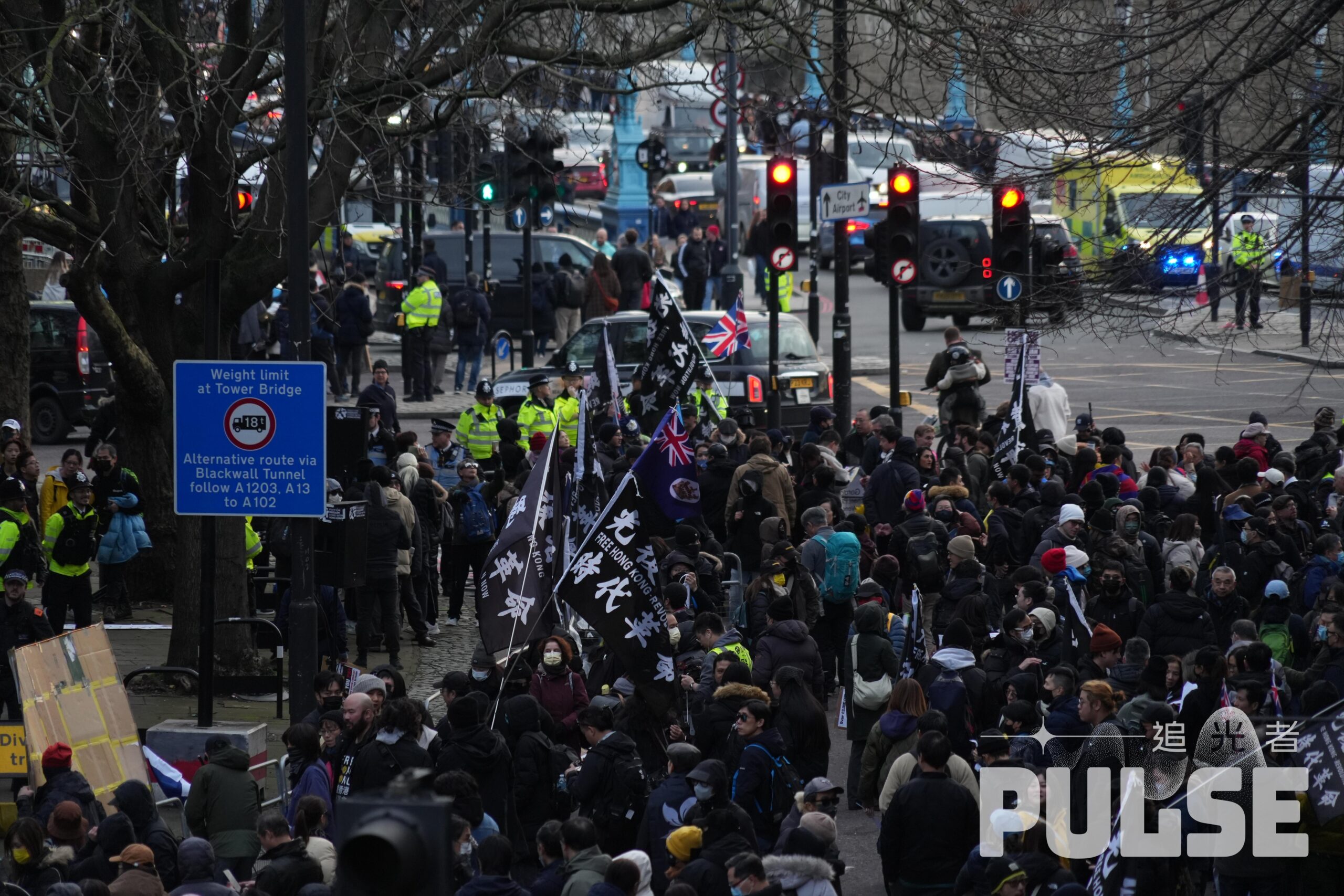 周六下午2時的集會在中國擬建超級大使館的皇家鑄幣廠舊址外舉行,集會開始前45前分鐘已有逾40名警員到場戒備及在鑄幣廠附近架好鐵馬,將旁邊的馬路劃為示威區,嚴禁示威者及記者走出示威區。