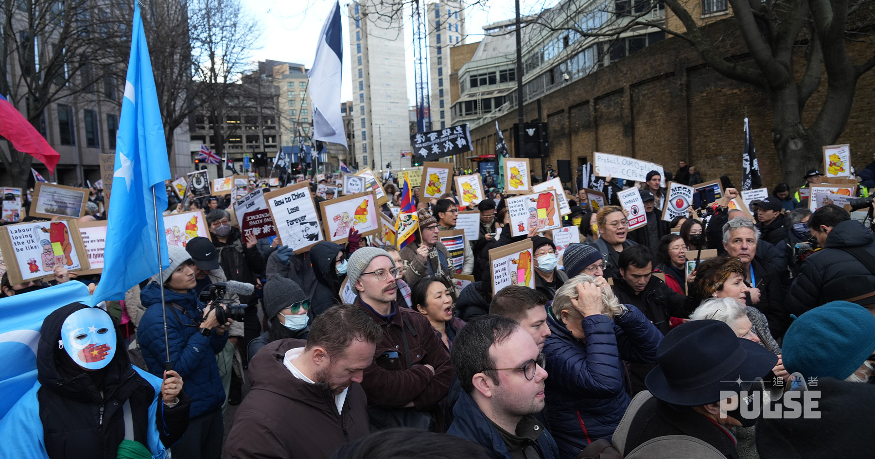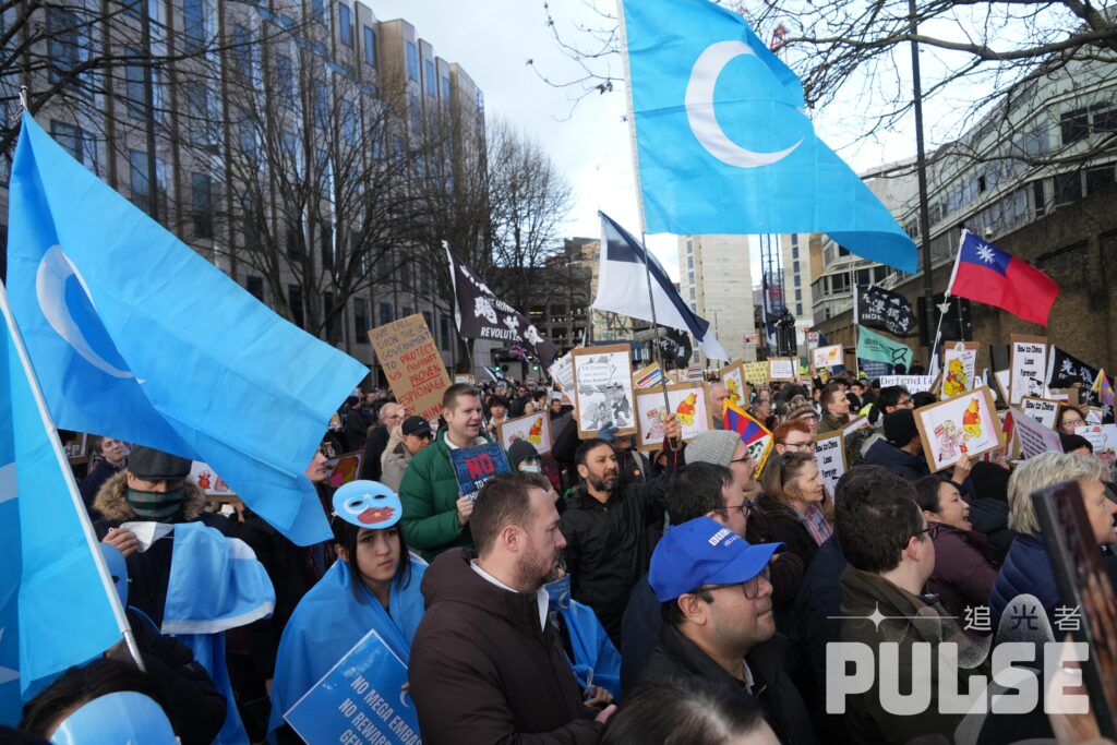 隨後示威者陸續到場,舉起不同標語表明反對中國超級大使館,包括「Bow to China, Lose Forever」、「Protect Our Optic cable. NO CCP’s mega embassy」,在場亦見寫有「釋放黎智英」及其他香港政治犯名字的橫幅,與及代表不同群體的旗幟,如藍白、「光時」、「香港獨立」和「南粵獨立」旗、西藏雪山獅子旗、東突厥斯坦伊斯蘭共和國國旗、英國國旗。集會期間,示威者叫喊英文口號如「Mega embassy, mega mistake」、「Repression at cross-border, no more, not here」,並指向皇家鑄幣廠大叫「shame on you」。