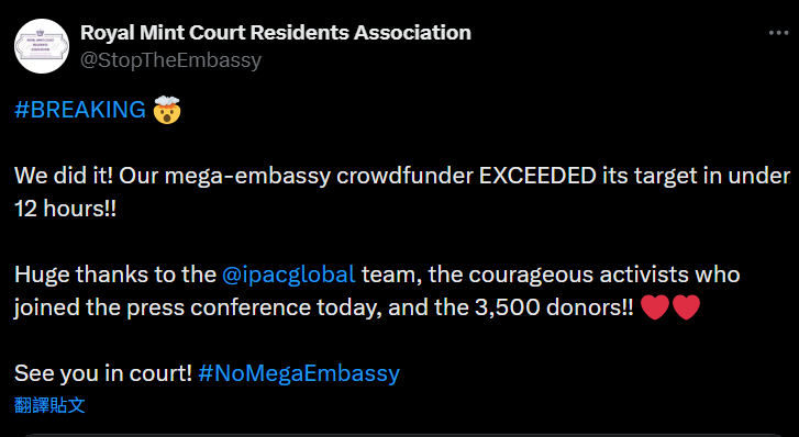 隨着英國政府正式對中國駐英「超級大使館」規劃「開綠燈」,規劃選址所在的舊皇家鑄幣廠居民協會宣佈正式啟動眾籌,將入稟法院尋求申請司法覆核推翻工黨政府決定,現時已經發現至少有4個可以挑戰的法律角度,最終在政府公佈決定後不足12小時就達標。有正被港府懸紅通緝的在英港人形容,當局的決定將縱容更多中共干預、滲透,國會議員亦形容英國在地緣政治上正陷險境。