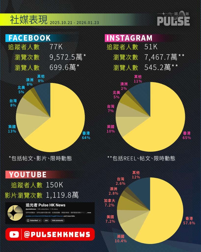 回顧過去百日,《追光者》的社媒包括 Facebook、Instagram、YouTube 三個月內瀏覽次數合計超過1.8億次,其中 Fb 超過9,500萬次,IG 超過7,400萬次,YouTube 影片瀏覽量亦達1,119萬次。讀者與觀眾遍佈全球,超過一半至六成在香港,其次是英國及北美,台灣與澳洲緊隨其後。