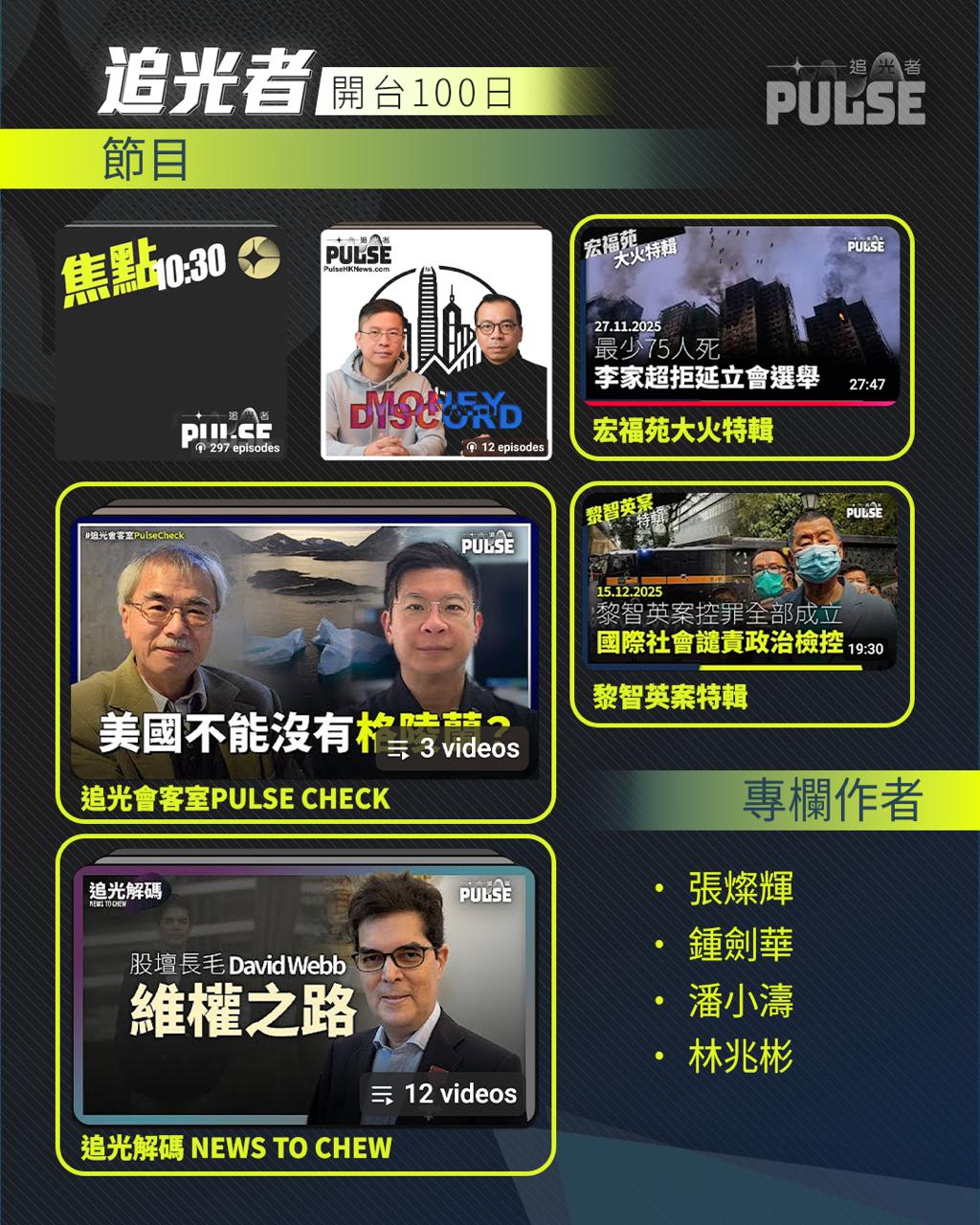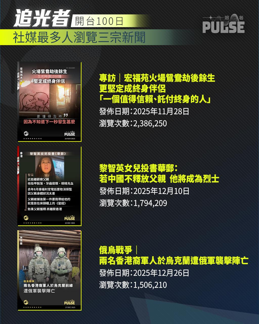 《追光者》去年10月20日正式開台,百日以來已發表逾千篇報道,聚焦香港、兩岸及國際議題,深入報道及分析中美角力下的地緣政治局勢,持續跟進黎智英國安案審訊的深度專題,並獨家揭露宏福苑承建商宏業涉圍標的內幕。同時,我們繼續走在最前線,直擊多場海外港人集會,包括在英港人反對中國超級大使館示威、海外香港社群悼念陣亡港裔烏軍,以及各地為宏福苑大火死難者的悼念會。