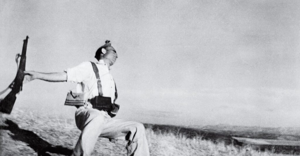 卡帕 (Robert Capa)1936年拍攝的《倒下的士兵》是這一困境的典型案例。這張照片捕捉了一名西班牙共和軍士兵中彈倒下的瞬間,成為戰爭攝影史上最著名的影像之一。然而,桑塔格指出,這張照片存在一個危險:雖然它(無論真假)捕捉了一個真正恐怖的時刻,但它具有某種編排的藝術性質,削弱了所記錄事件的恐怖感(Sontag, 2003: 59)。