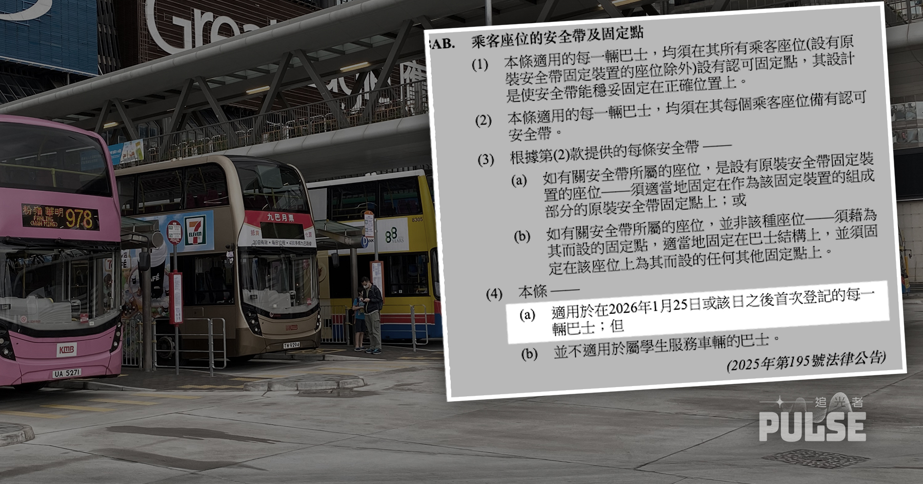 但翻看法例原文即第374F章《道路交通(安全裝備)規例》,8AB條提及,條例適用的每一輛巴士,每個乘客座位均須備有認可安全帶。至於8AB條第4款就提到「適用於在2026年1月25日或該日之後首次登記的每一輛巴士」。至於8D條條文就是關於「乘客須配用安全帶」規定,凡乘客乘坐第8AB適用的巴士,都必須佩戴安全帶。