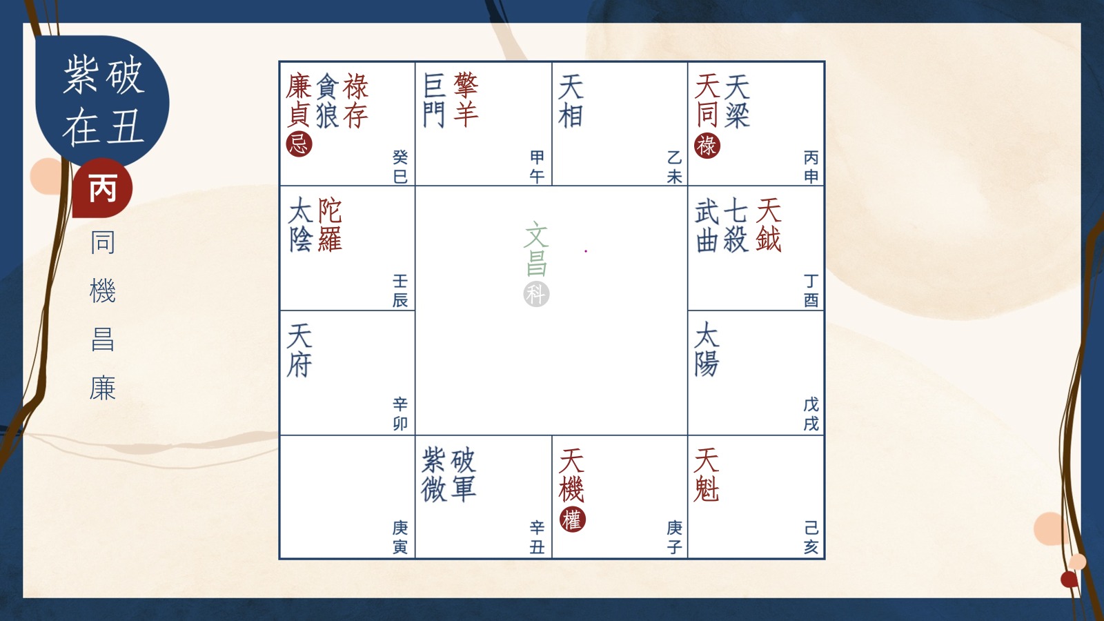 丙干四化不管任何基本盤必已具備此共通性:天同化祿(格外直率任性的進取)、天機化權(能把機靈聚焦)、文昌化科(誇誇而淡),和廉貞化忌(近距離遊走於核心外圍)。