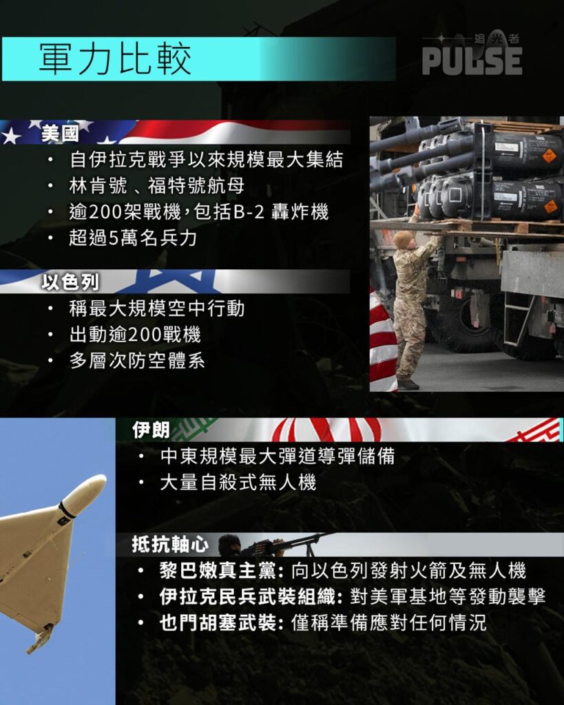 美軍今次行動是自伊拉克戰爭以來最大規模的集結,至於海軍、空軍被美以聯軍嚴重摧毀的伊朗,則靠大量自殺式無人機進行反撃,其抵抗軸心亦加入參戰方。在國際方面,澳洲、加拿大等均表態支持美軍打撃伊朗的行動,但英國、德國、法國等傳統西方盟友則留有餘地,英國僅同意美方使用英軍事基地作防禦用途;西班牙、挪威等歐洲國家更譴責美軍行動。受中東緊張局勢持續影響,全球能源供應鏈受阻,國際油價應聲上揚。