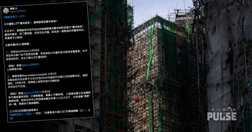 宏福苑大火|中國獨立記者高瑜發文稱災難是人禍 被民警上門筆錄