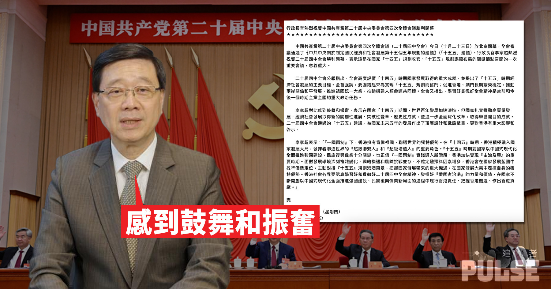 特首李家超在公報發出後,傍晚6時23分隨即發表近900字中共式文宣的新聞稿,大字標題《行政長官熱烈祝賀中國共產黨第二十屆中央委員會第四次全體會議勝利閉幕》,表示對公報內容「感到鼓舞和振奮」。雖然四中全會公報無提及一國兩制,但李家超在新聞稿強調,在一國兩制下香港擁有背靠祖國、聯通世界的獨特優勢,同時不忘擦鞋稱「十五五」規劃對中國強國建設、民族復興十分關鍵,也是香港「由治及興」的重要時期。
