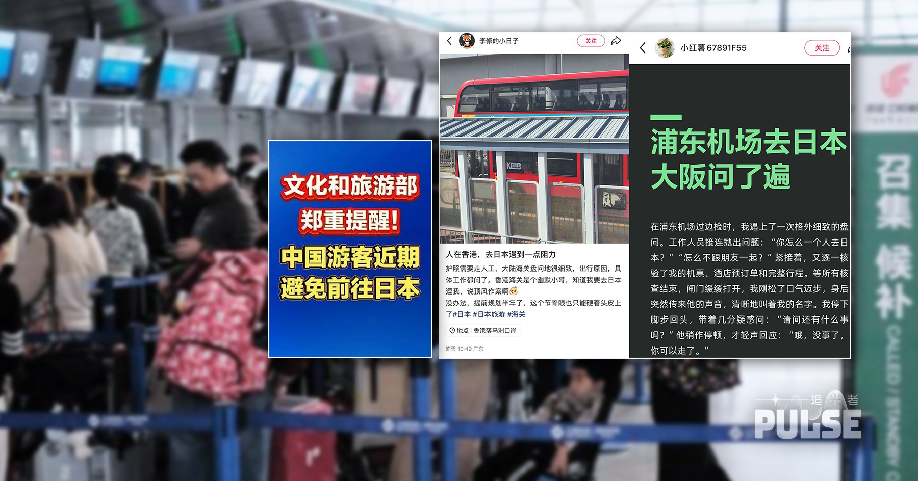 過去幾日,中國社交平台流傳多名赴日旅客,在機場遭海關為難的經歷。有上海旅客表示,在浦東機場準備飛往大阪時,遭海關「格外細緻」的盤問,整個過程緊張而離奇。關員接連發問,「你怎麼一個人去日本?怎麼不跟朋友一起?」,之後再詳細查閱機票、住宿及行程安排。即使獲准過關,旅客甫踏出閘口又被叫停,關員沉默片刻後才再說:「沒事了,你可以走了。」