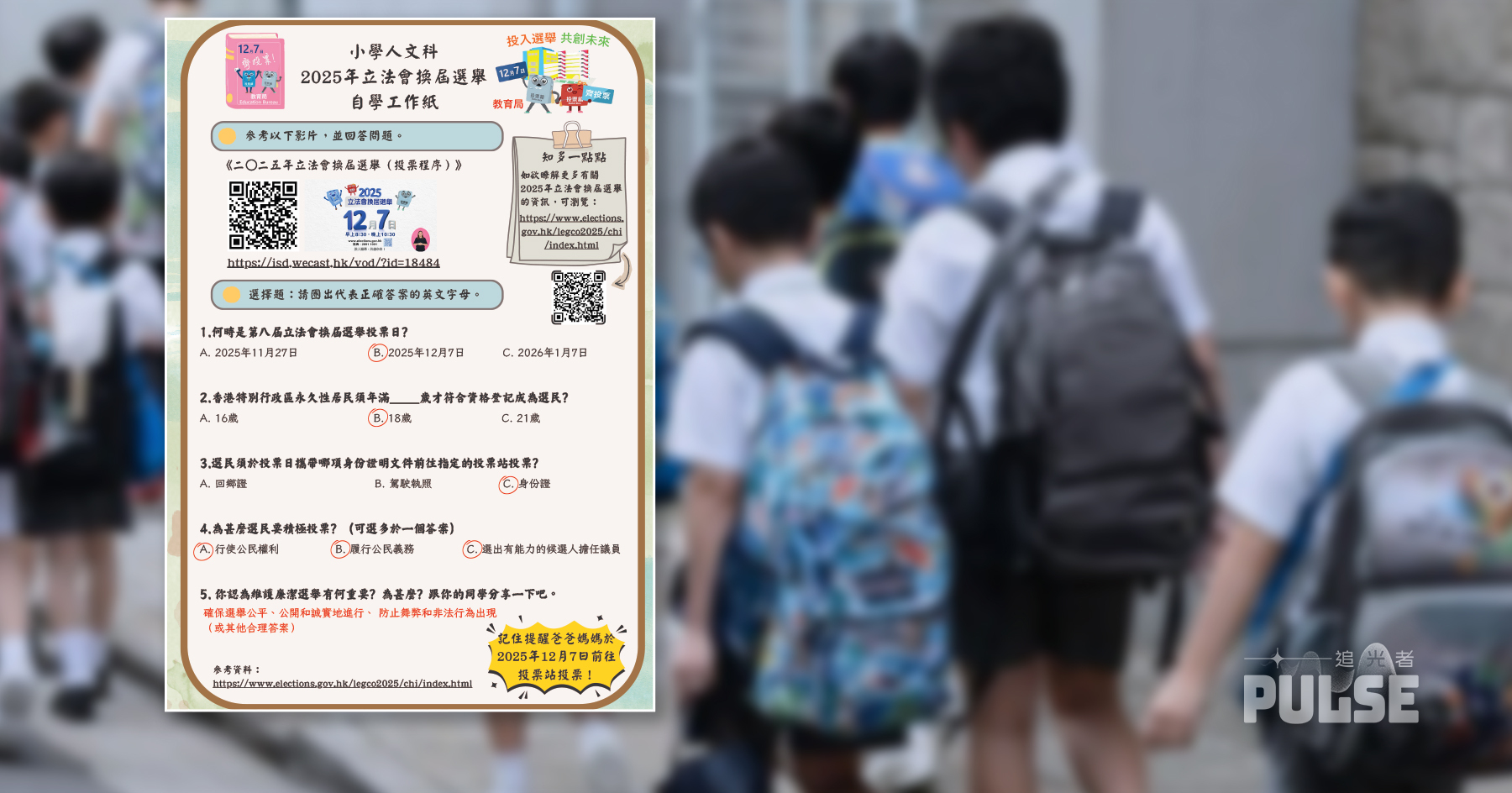 教育局上周推出小學人文科最新的「學與教資源」,以「廉潔選舉和守法守規」為主題,「2025年立法會換屆選舉自學工作紙」要求學生先參考政府30秒宣傳短片,再回答4條選擇題和1條討論題目,包括投票日期、選民資格、投票需攜帶證件等;其中一題問「為甚麼選民要積極投票」,標準答案是「行使公民權利」、「履行公民義務」、「選出有能力的候選人擔任議員」3項全選。