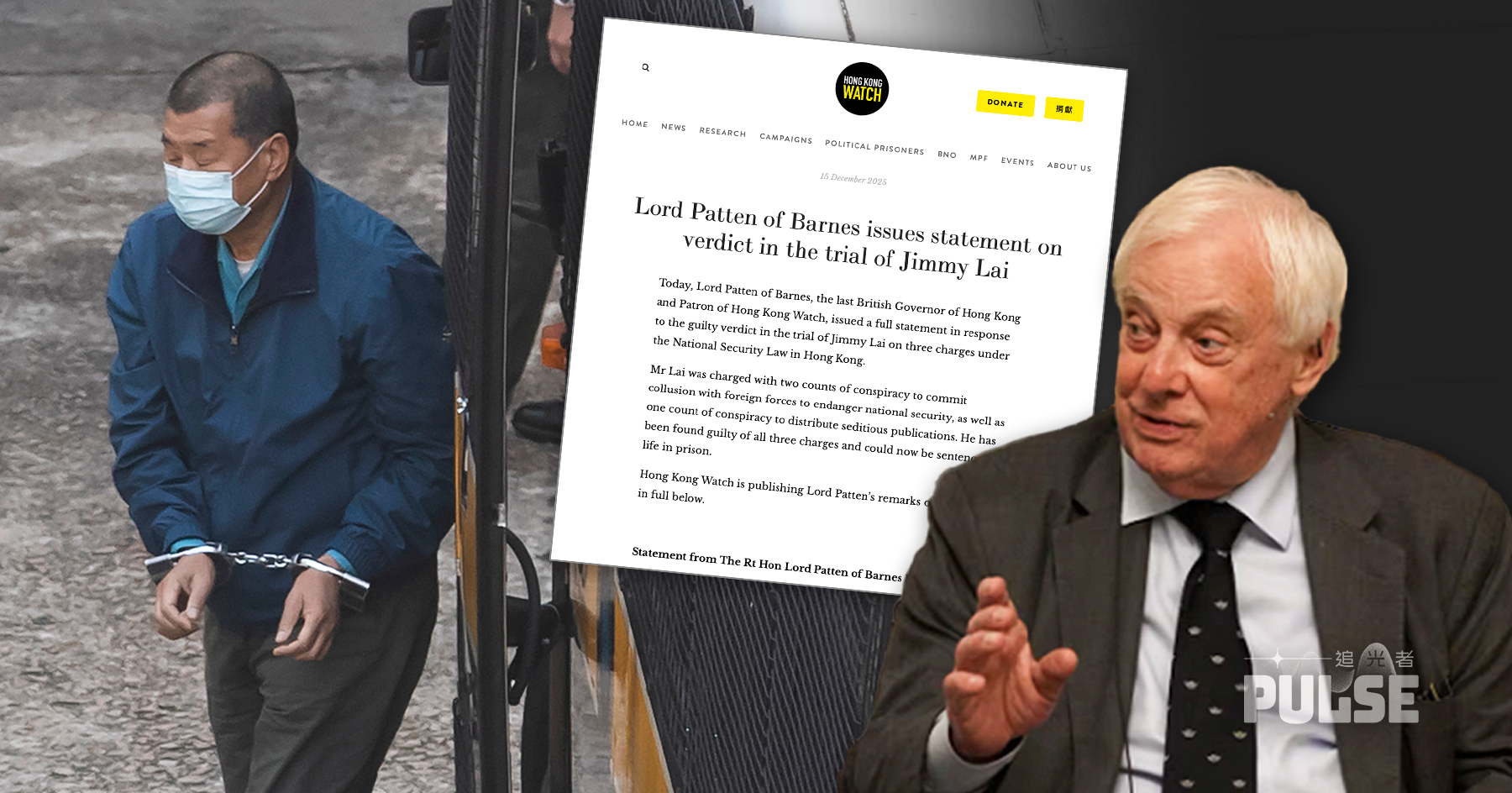 香港最後一任港督、香港監察(Hong Kong Watch)贊助人彭定康昨(15日)發表長篇聲明,指黎智英案既由政治任命法官審理、也不設陪審團,是中共藐視《中英聯合聲明》,以及蔑視自由的最有力證據之一。