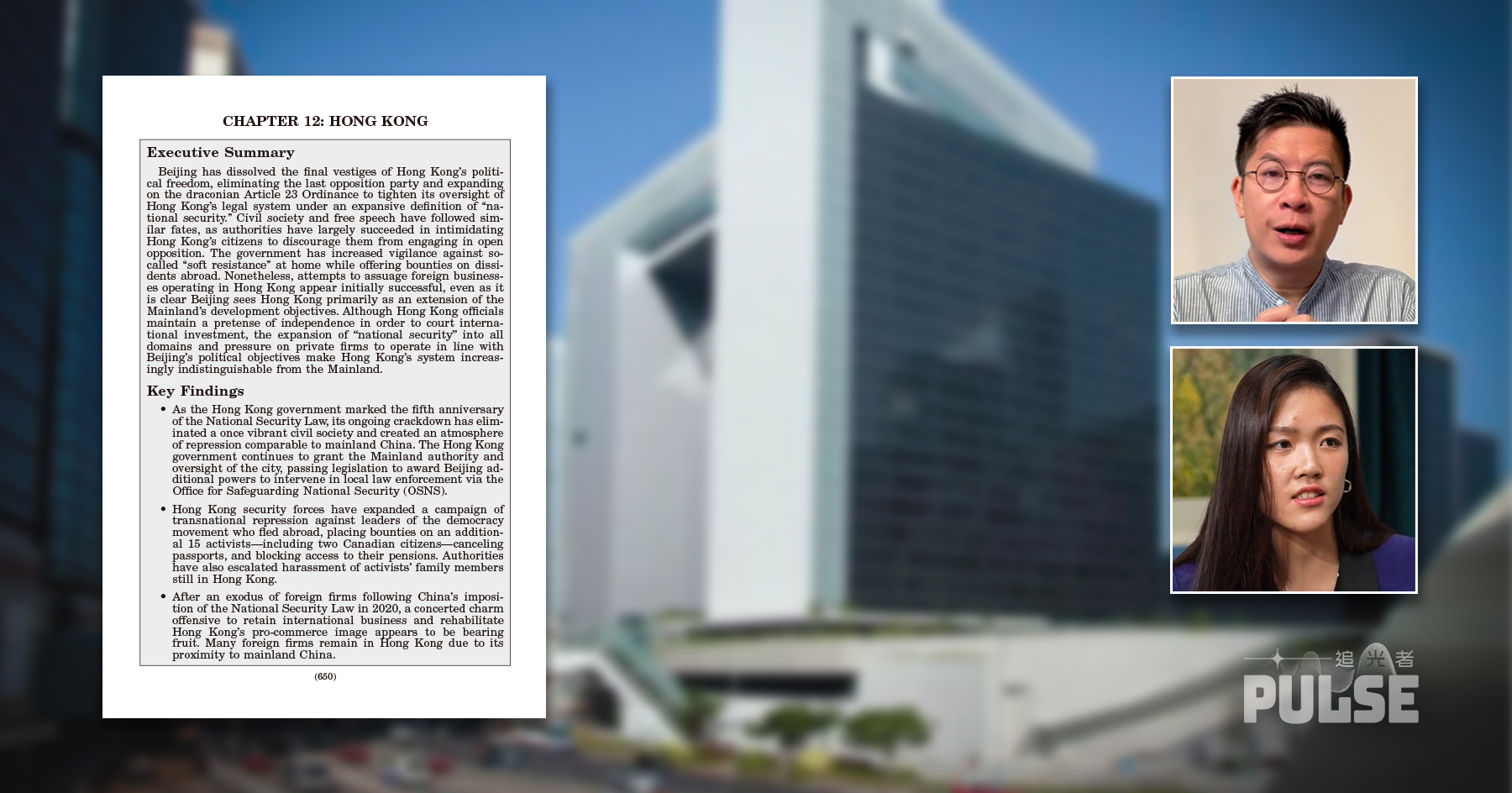 美國「美中經濟與安全審議委員會」發表2025報告,指出香港僅餘的政治自由被「瓦解」,公民社會與言論自由也遭「類似命運」,特別是國家安全擴展至所有領域,連私人企業也需配合北京政治目標。CFHK政策和倡議專員許穎婷認為,今年報告的態度比去年更明確和強硬;財經評論員利世民則分析,報告因應香港成制裁規避樞紐而建議重新檢視本港美元結算中心的地位,或對銀行金融體系帶來衝擊。特區政府反駁報告污衊抹黑,予以強烈譴責。