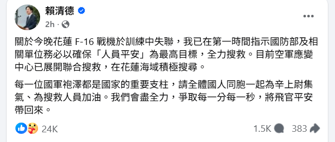 台灣總統賴清德周二晚在社交媒體發帖文,指已第一時間指示國防部及相關單位展開搜教,確保以人員平安為最高目標,會盡全力爭取時間將機師平安帶回來。現時空軍應變中心正在花蓮海域積極進行搜救工作。
