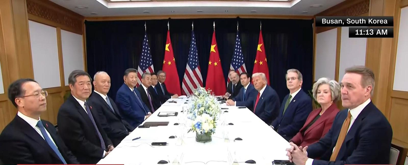 美國總統特朗普在北京時間星期四上午十點,在南韓釜山金海國際機場與中國國家主席習近平會面。特朗普首先到場,他在台上等候習近平上前握手。
