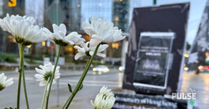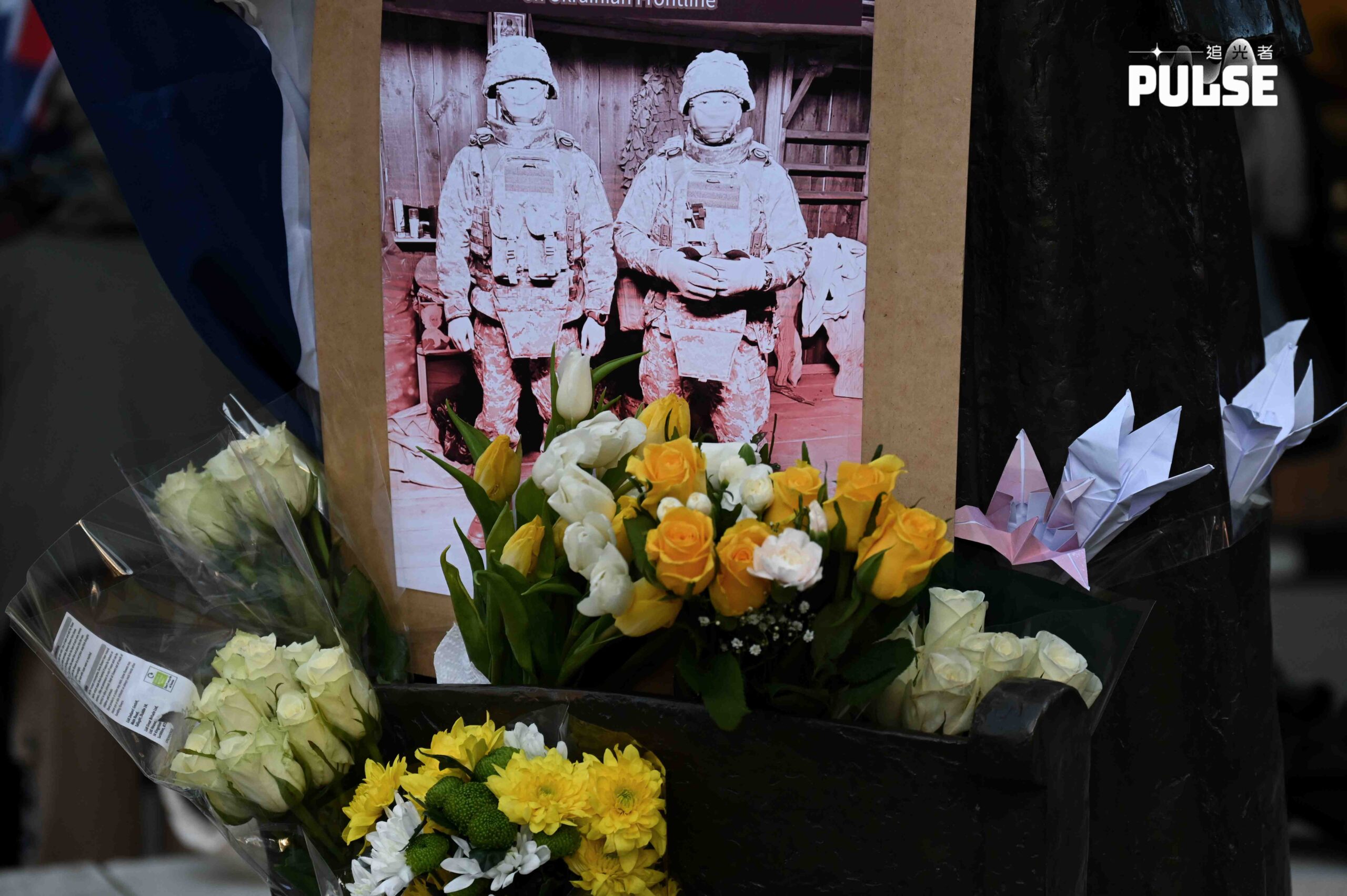 數十在英港人及烏克蘭人上周六冒着寒風在曼城市中心聖彼德廣場(St Peter Square)出席悼念活動,透過摺紙鶴、獻花向上月26日在烏克蘭扎波羅熱執行任務時犧牲的港人「Pin」和「水」致敬。