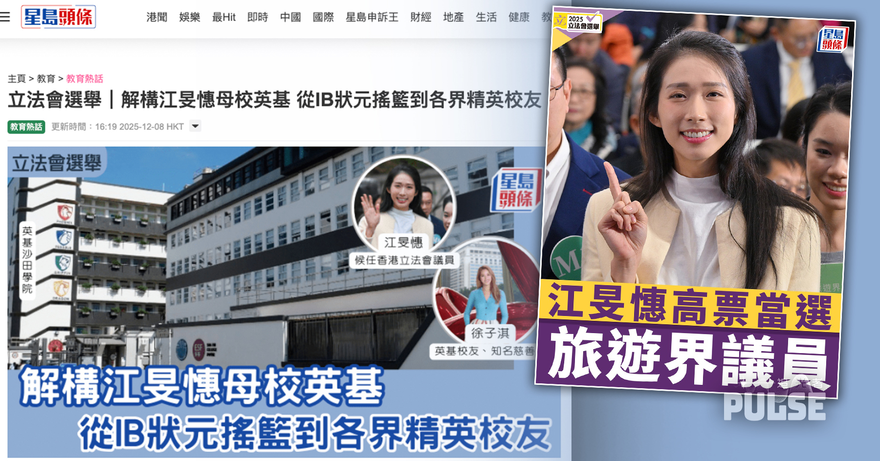 《星島頭條》在社交媒體不斷更新選舉消息,其中發布「微笑劍后」江旻憓以131票對23票擊敗對手的新聞時,立下「高票當選」的標題。 而其網站則不只在港聞版報道,更於教育版撰寫「教育熱話」文章,題為「解構江旻憓母校英基 從IB狀元搖籃到各界精英校友」,提及她「以壓倒性票數當選」,並介紹她始於英基的學習之路,以至學校課程架構及學費。