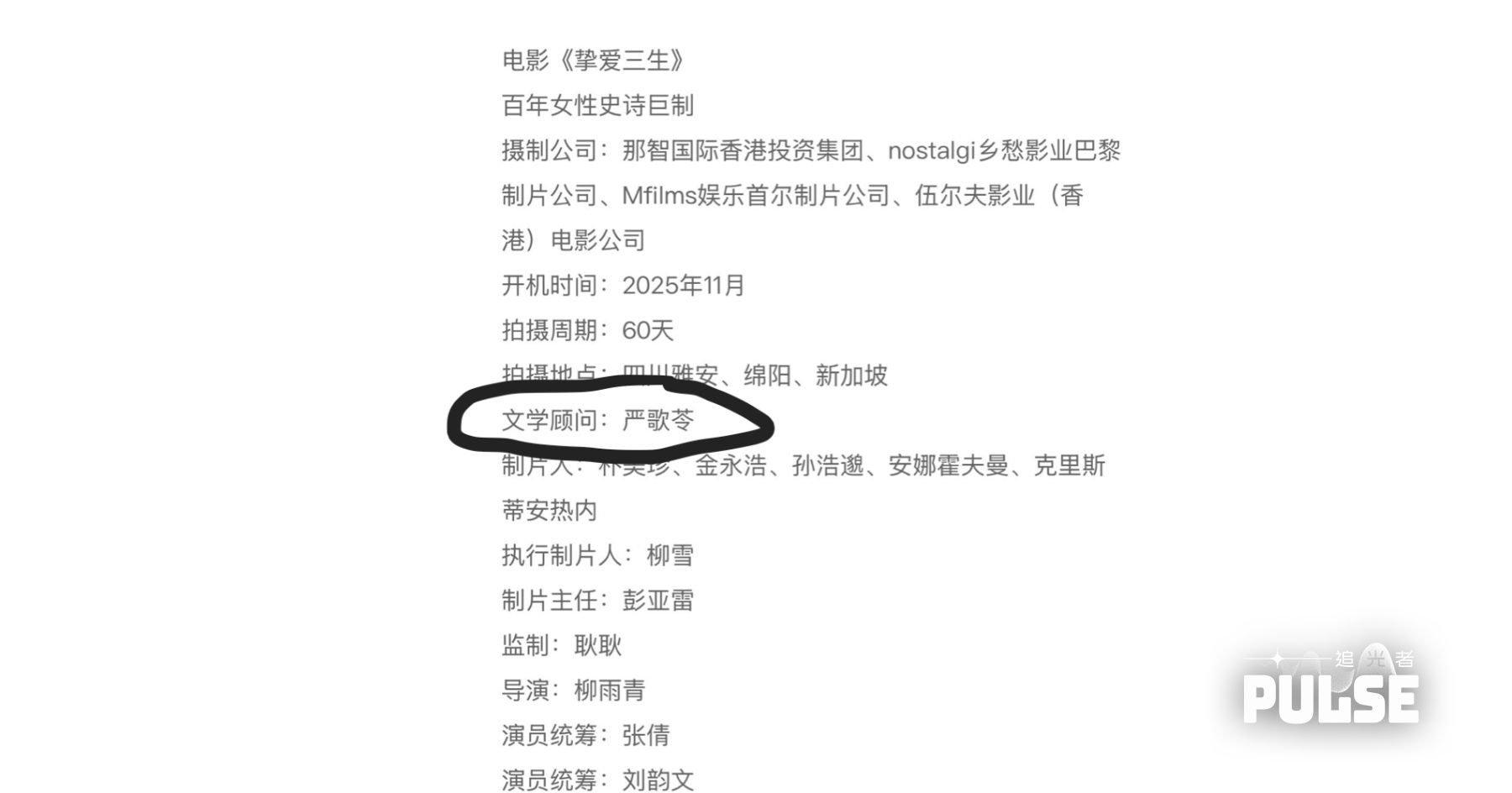 影片將於2025年11月開機,拍攝周期60天,主要拍攝地點在四川雅安、綿陽、新加坡,前期籌備地址位於上海。而劇組名單中,文學顧問為嚴歌苓,這是自2022年以來,嚴歌苓名字再次出現在中國內地影視作品中。該片故事講述跨越三生的愛情與女性命運,融入歷史與情感元素。儘管官方尚未正式公布,但網路截圖已廣泛流傳,部分網友猜測這可能是嚴歌苓作品時隔三年後首次在內地重現。